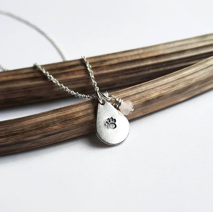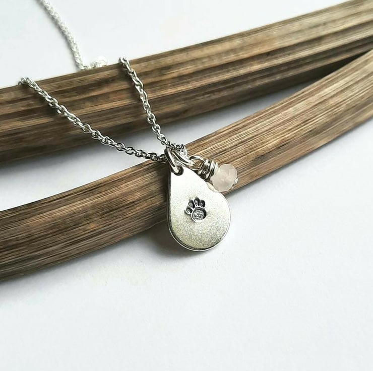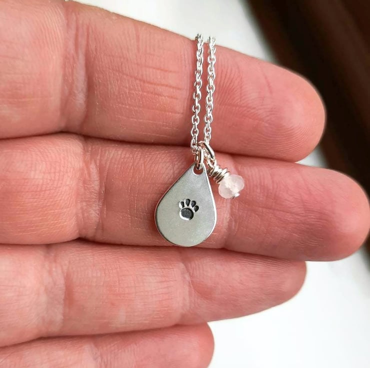 The teardrop shaped pendant is teamed with a little rose quartz gemstone, wire wrapped in sterling silver to create a little charm. Rose quartz is the stone of Unconditional Love, which is what we give to and receive from our beloved fur babies!