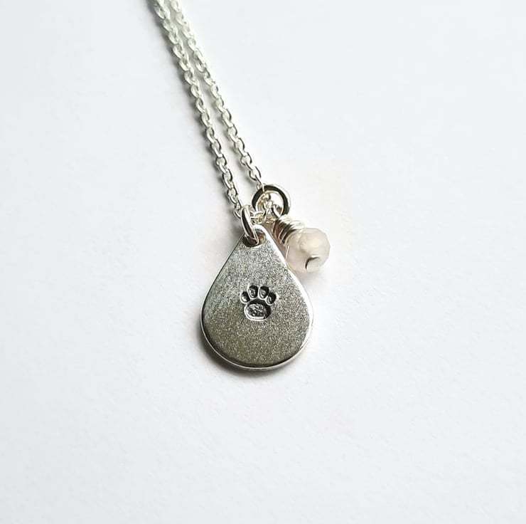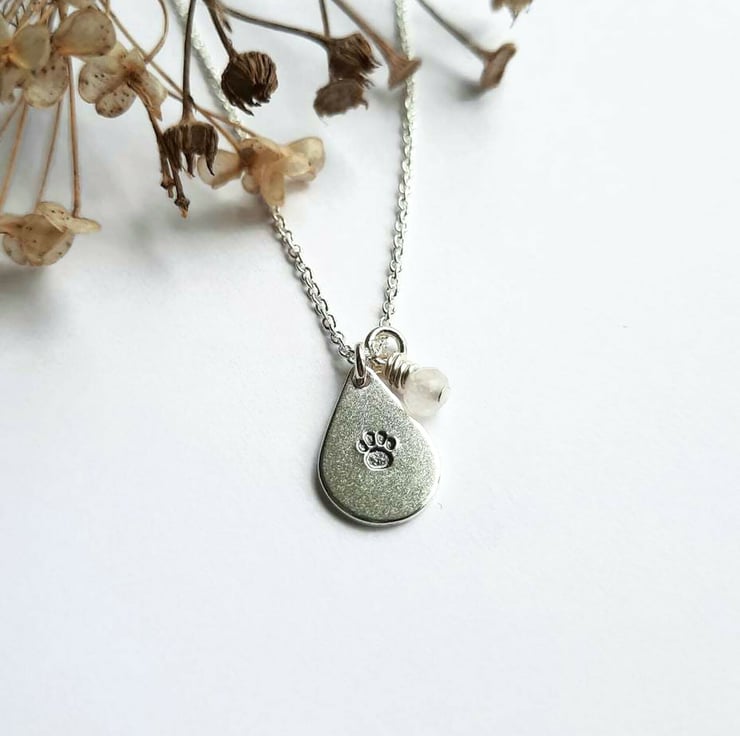 A sweet little 925 sterling silver teardrop pendant, hand stamped with a tiny paw print - perfect for any dog or cat lover.
