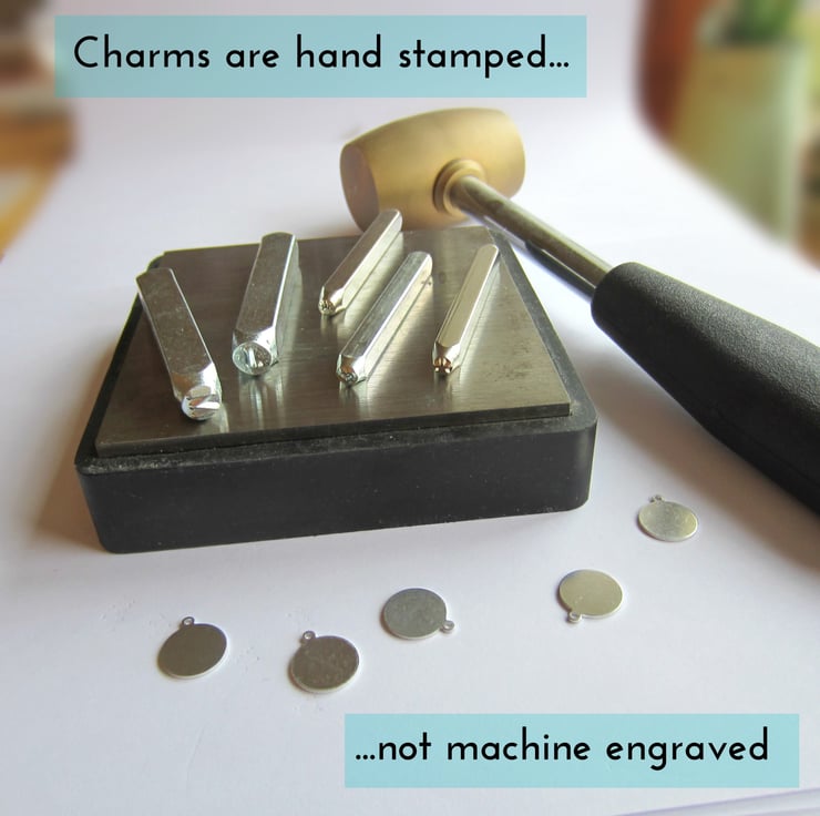 These pendants are hand stamped by me (not machine engraved), a process which involves striking the pendant with a metal stamp using a heavy hammer. Therefore the placing and depth of the stamp can vary slightly from piece to piece but this just adds to the unique charm of hand stamping.