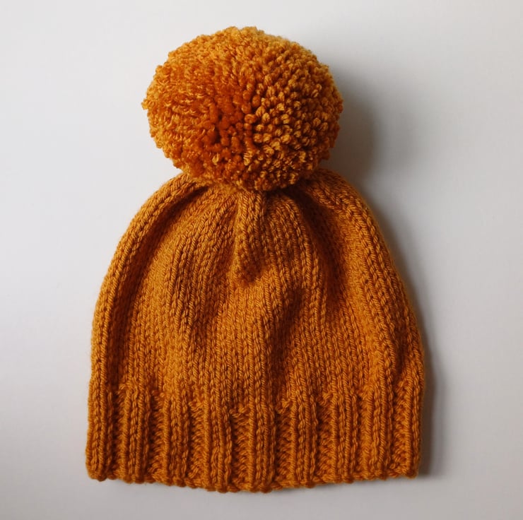 This bobble hat is hand knitted in a dark mustard chunky acrylic yarn with a dark mustard chunky and squishy pom pom sewn on.