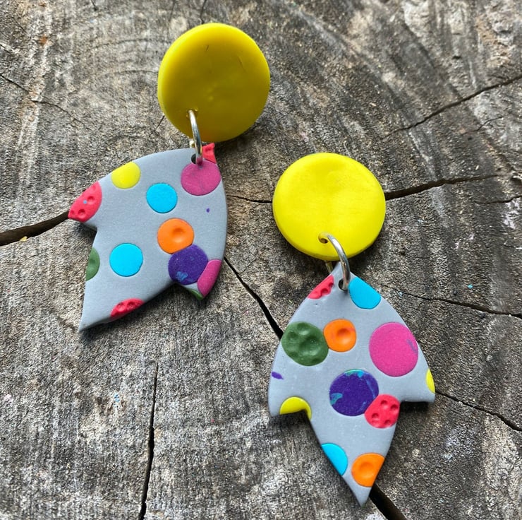 Beautiful bright spotty earrings. These have a grey background with rainbow coloured spots all over them. There a are a few different shapes in this batch, the tulip shape which is approx 5.5cms in total length with he tulip shape approx 3.5 cms. The round shapes one with the pinky red top and one with a spotty top with approx 3cms in diameter and the the cross shape which has a drop of approx 4.5cms.