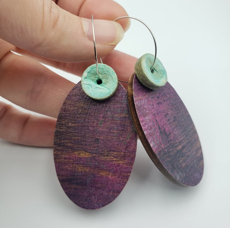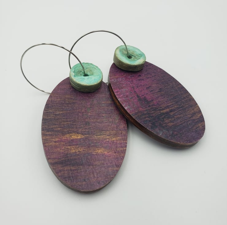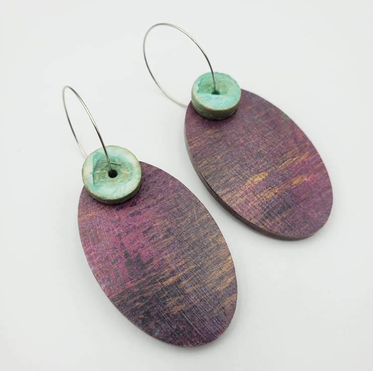 These oval shaped earrings are in a lovely burgundy colour with a touch of antique gold and black running through the print. I have finished them off with a mint coloured button bead and a silver plated hoop. The button bead can easily be removed.