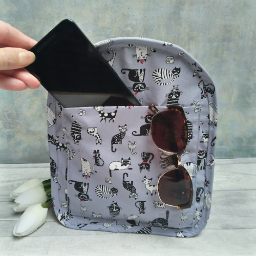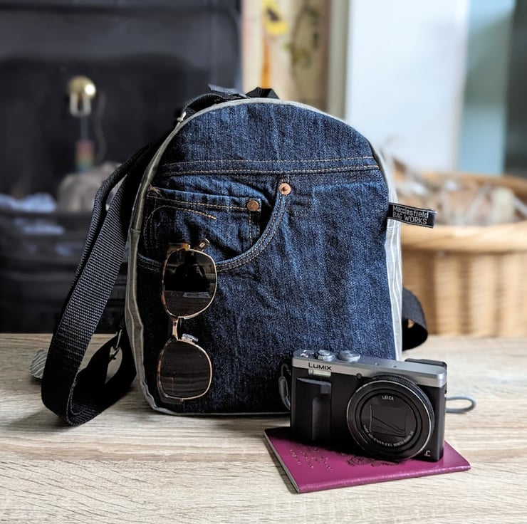 It has been carefully designed and handmade with recycled denim on the front of the bag with oilcloth making up the rest of the bag. The front, denim panel of the bag is interlined with oilcloth to give added water resistance. The front of the backpack has a pocket detail from the original jeans. The back of the bag has yet another pocket - this time secured with a black plastic snap closure. Inside, it's lined with a cute, quirky cats design cotton lining (see final photo) and a divided slip pocket means there's somewhere to keep you phone and pens. A key hook is another useful feature of the bag (see photo showing inside of bag). A double, black zipper means accessing the inside of the bag is quick and easy.