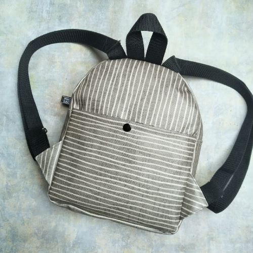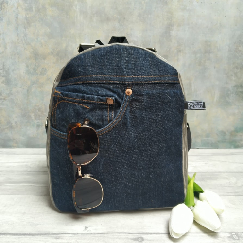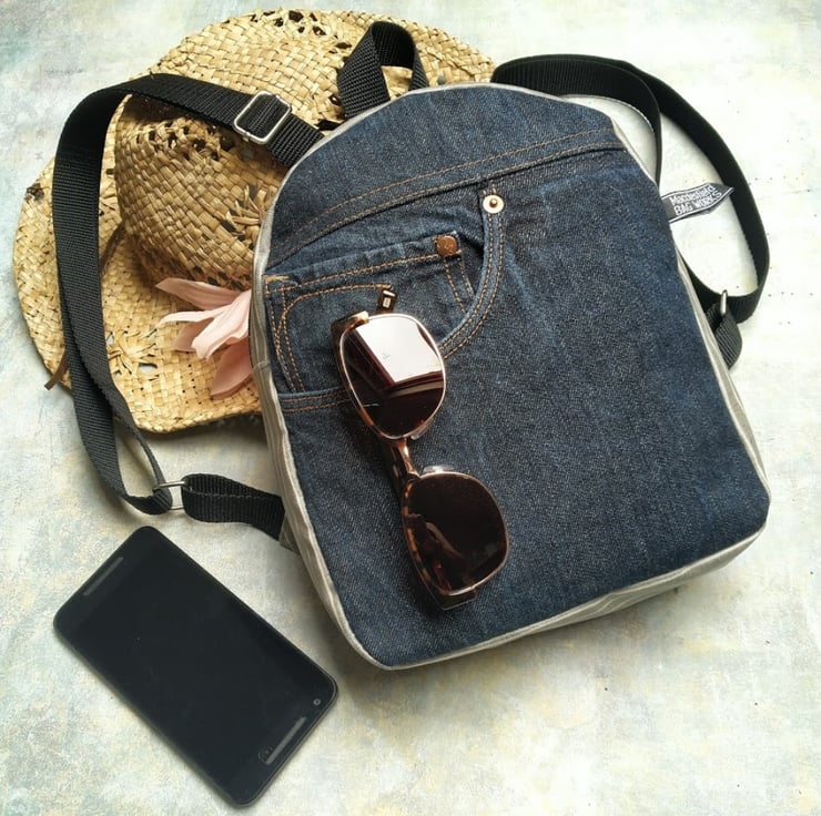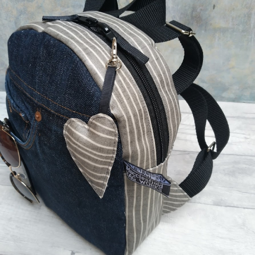 Mini denim backpack - perfect for hands free travelling, walking, shopping or days out...this small backpack has been designed and handmade using recycled, pre-loved denim jeans and striped grey PVC coated cotton (oilcloth).