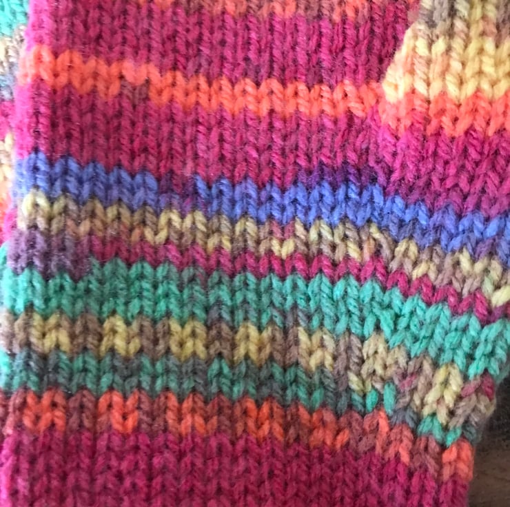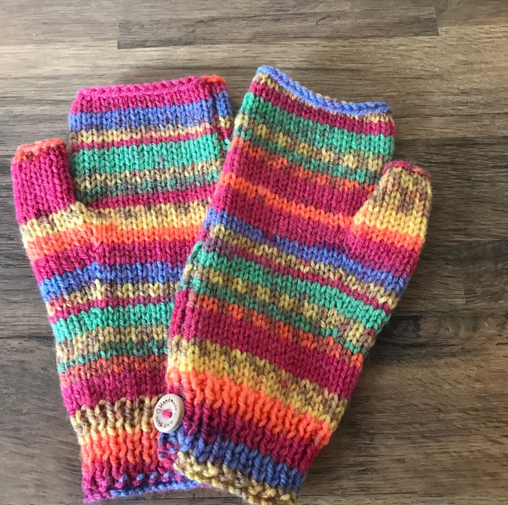 Hand knitted fingerless mittens in a random, self-patterning yarn of dazzling colours ranging from blue to golden yellow. The yarn is a beautifully soft acrylic wool blend and they fit average size ladies hand.