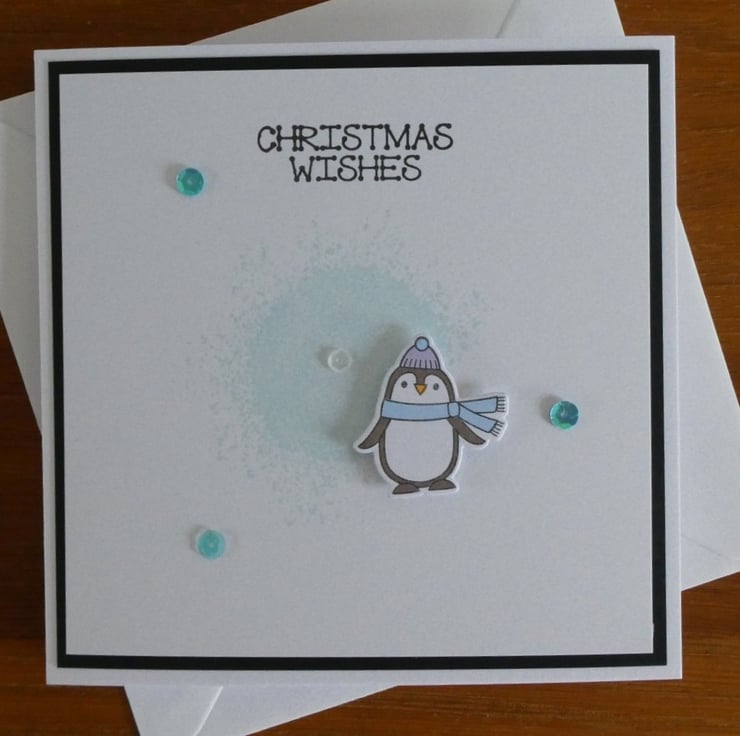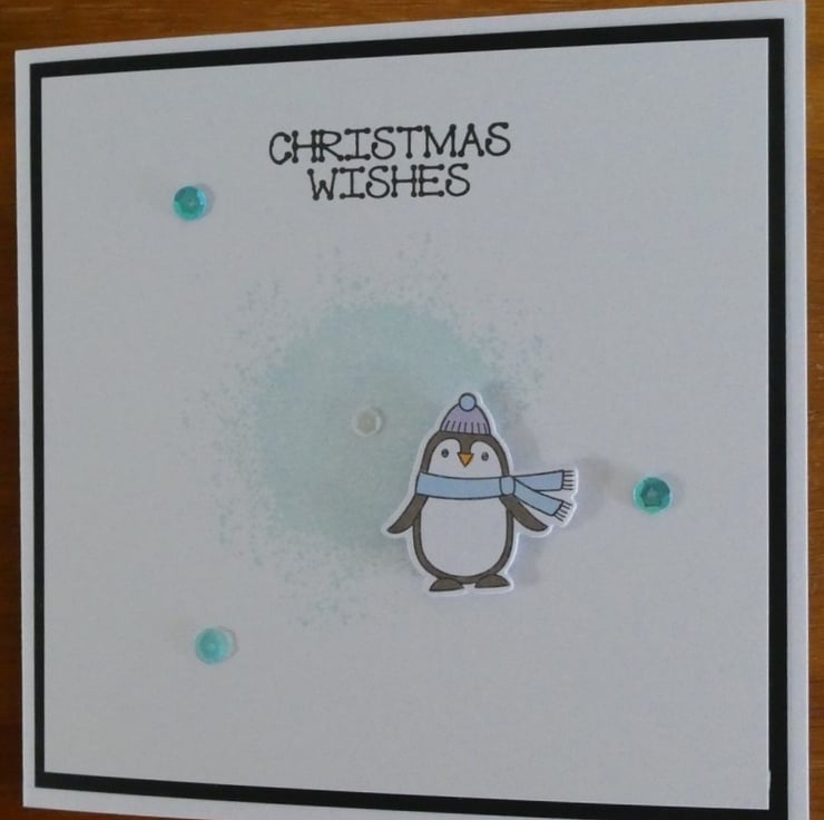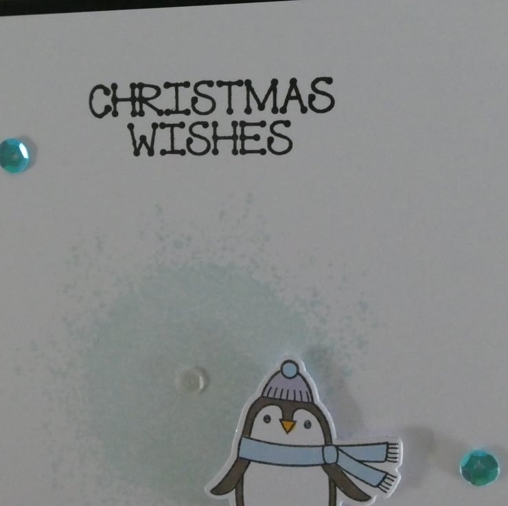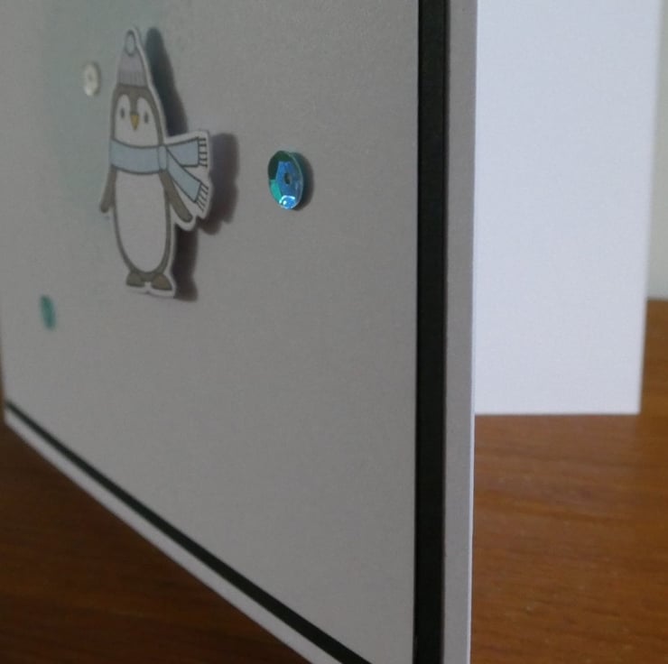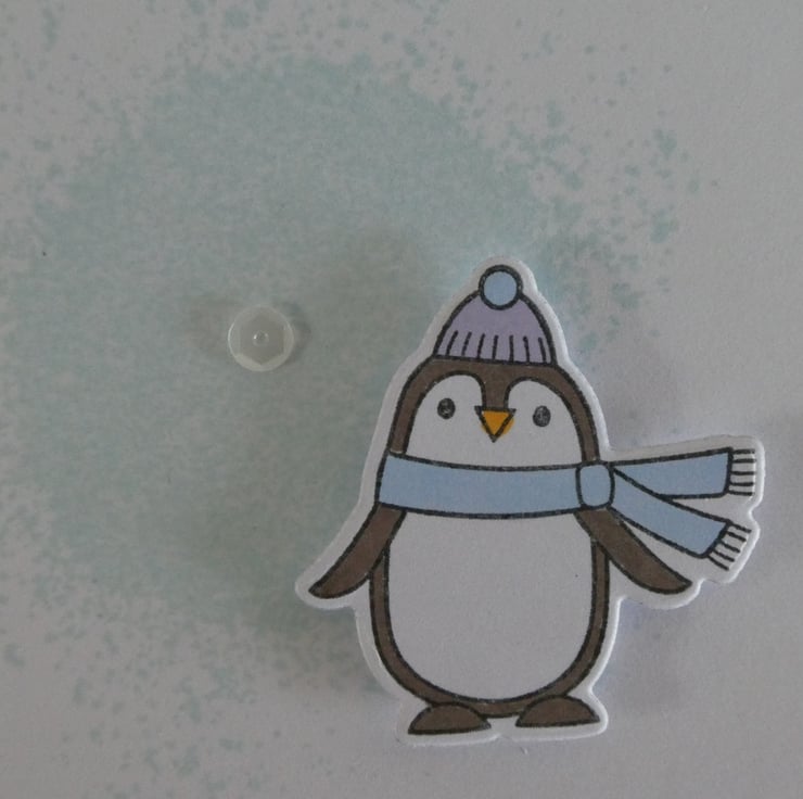 It features a cute penguin ready for the winter weather in a scarf and bobble hat, he has been slightly raised above a pale blue 'splash' background. The design has been finished with a scattering of sequins.
