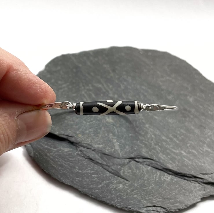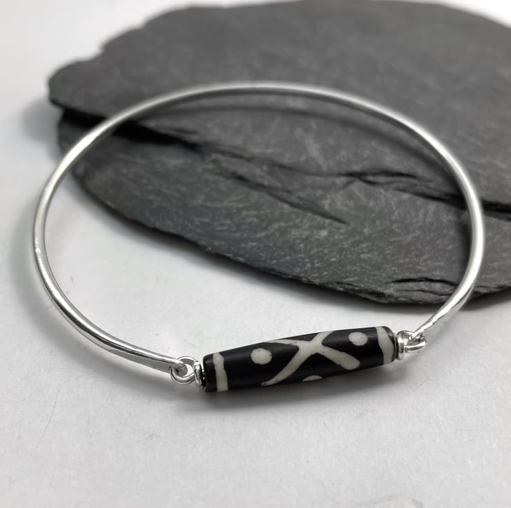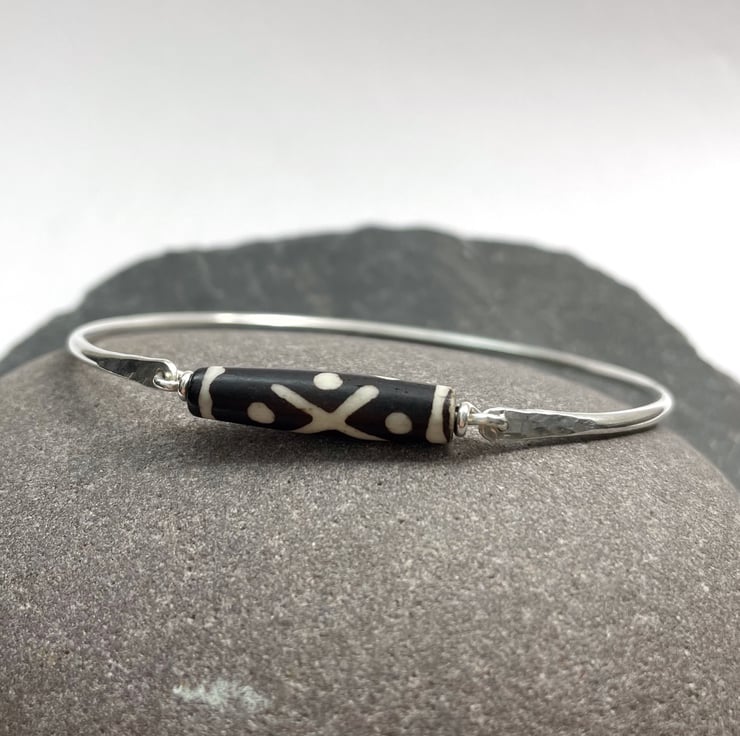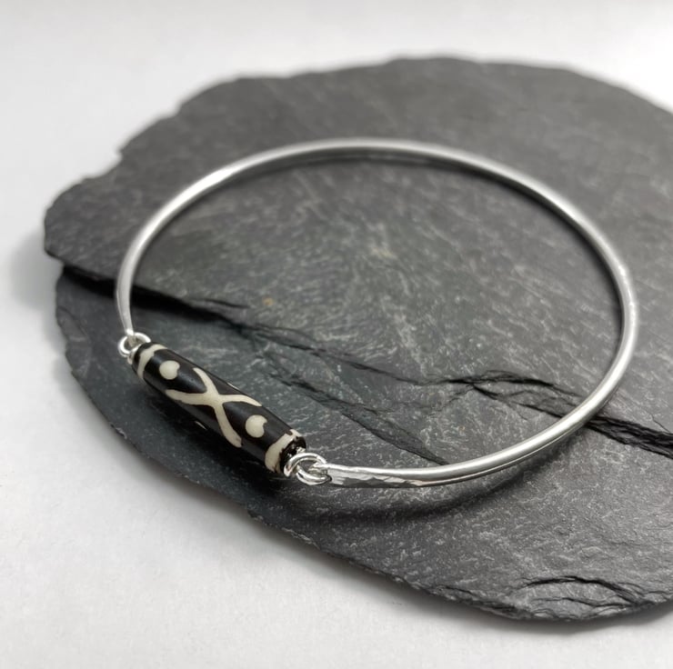 A lightweight silver bangle with a vintage black and cream bone Dzi bead focal.