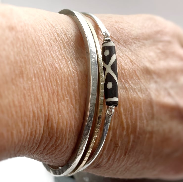 This round bangle can be part of a stack or worn alone. It is made from 2mm silver wire that has hammered ends that are drilled to hold the Dzi bead.