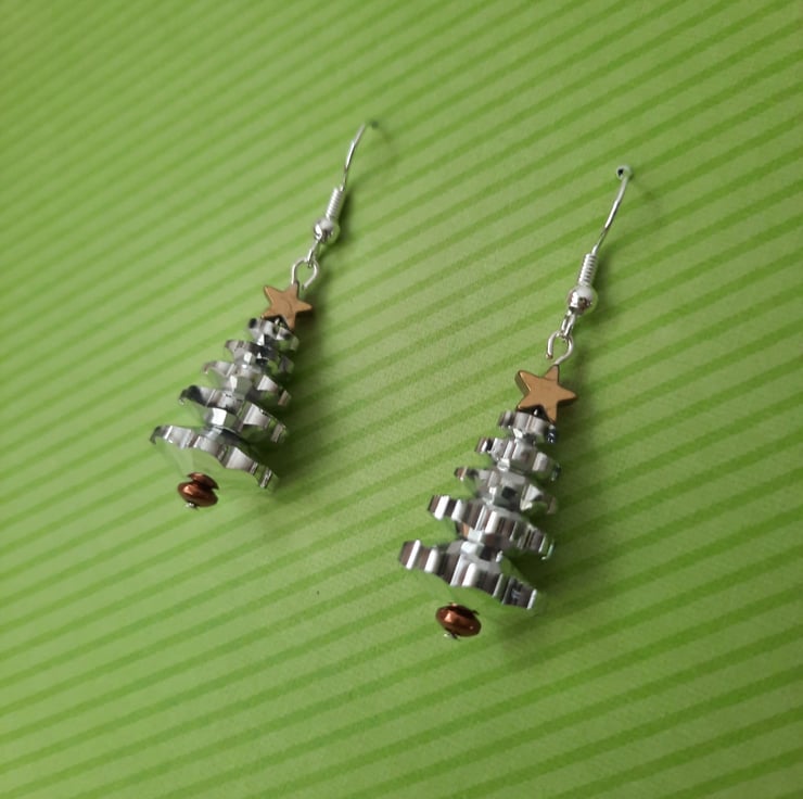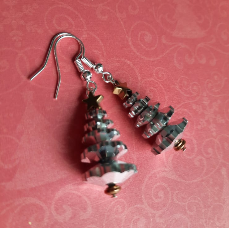 A pair of Christmas tree earrings made using silver crystal flower shaped beads and a Hematite base and star. They have a drop of around 3cm from the base of the ear wire and are approx. 1.4cm wide. The ear wires are silver plated.