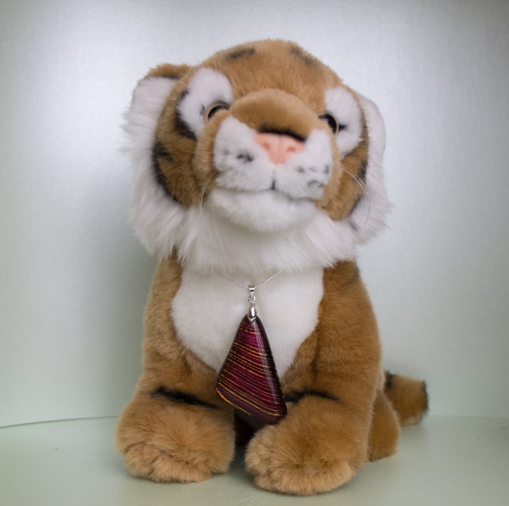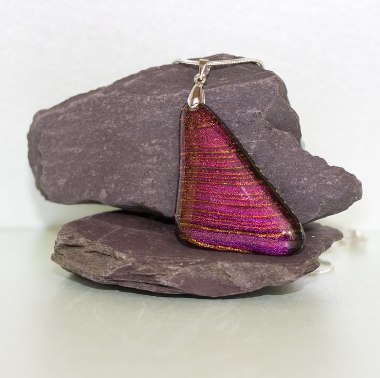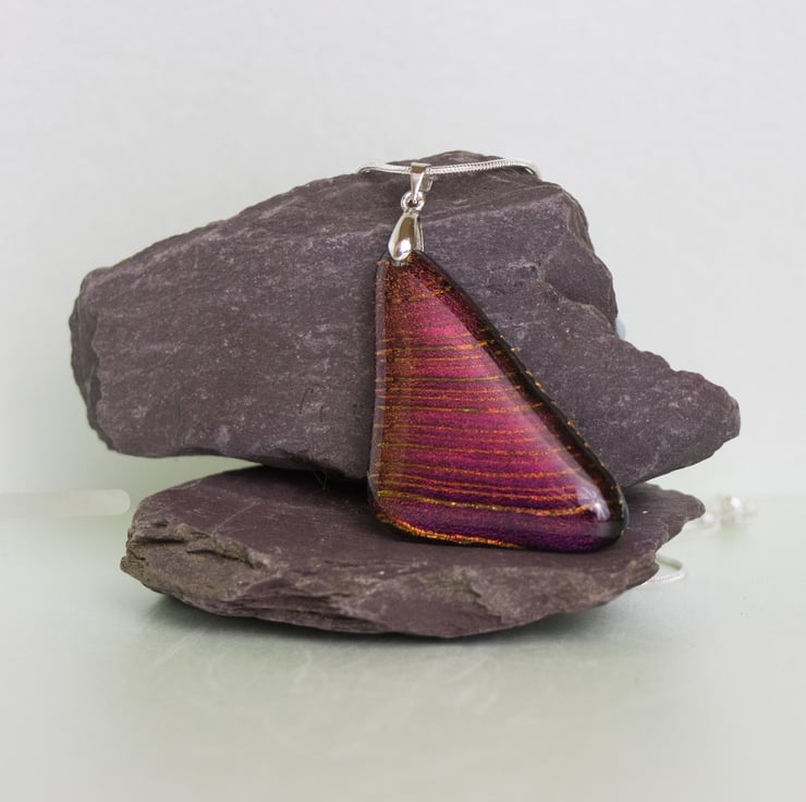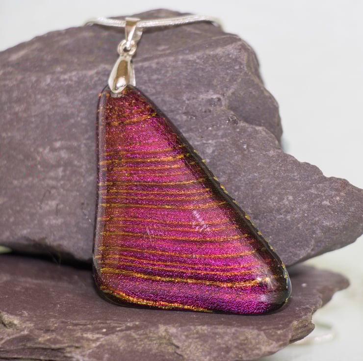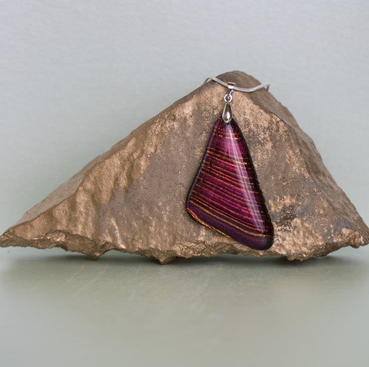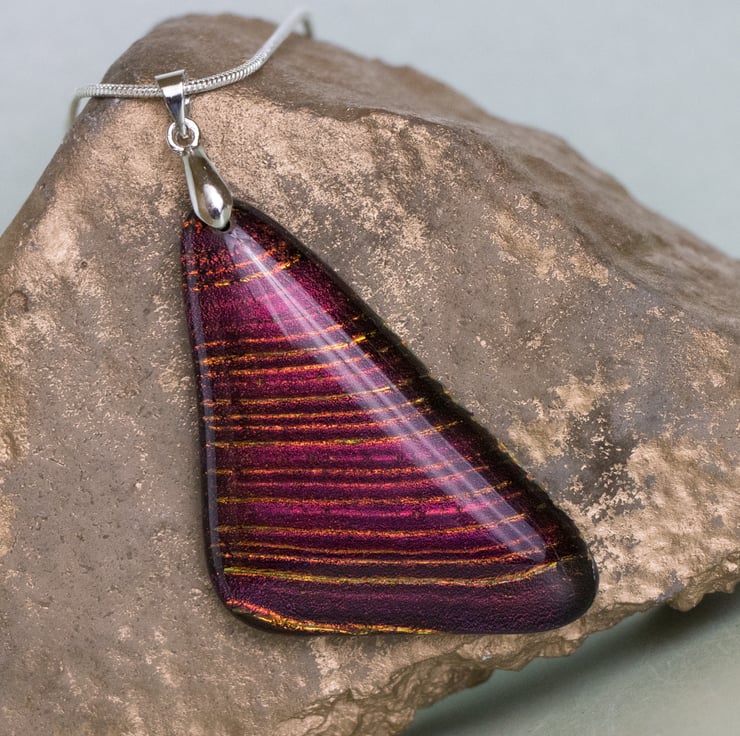 One of our larger designs, this triangular pendant necklace has lovely thin lines of reds and gold running through it.