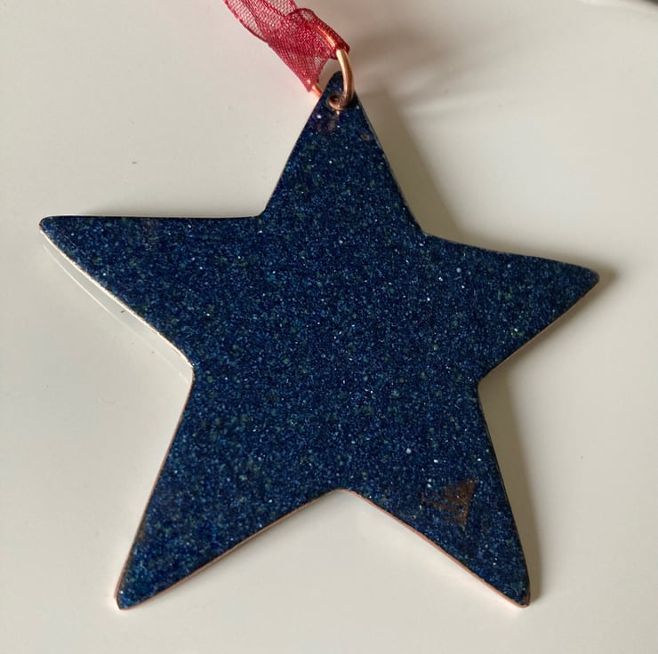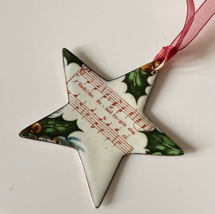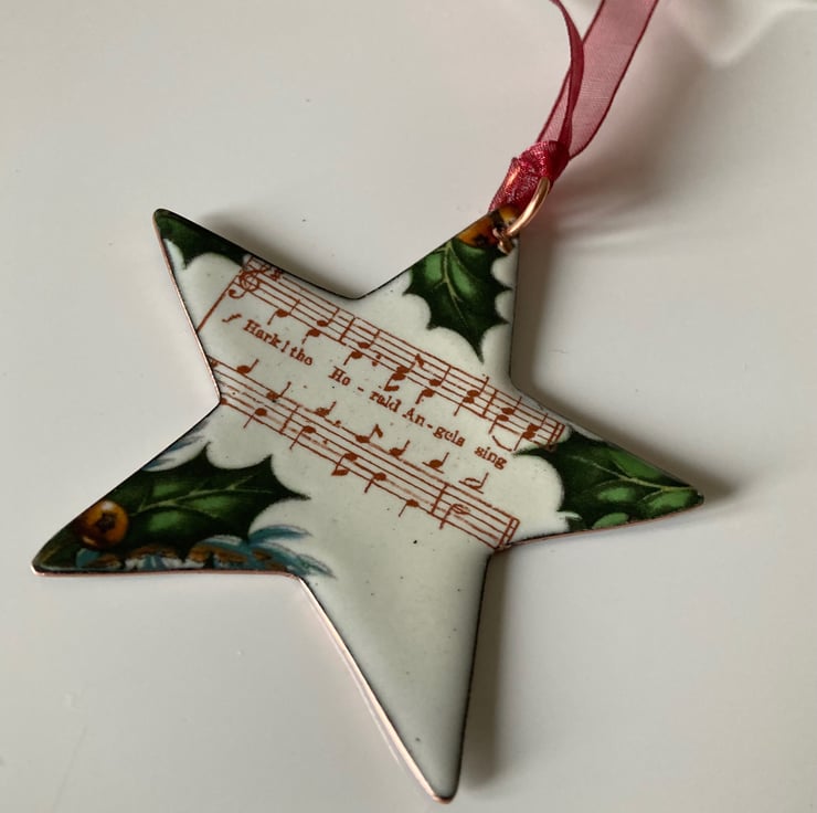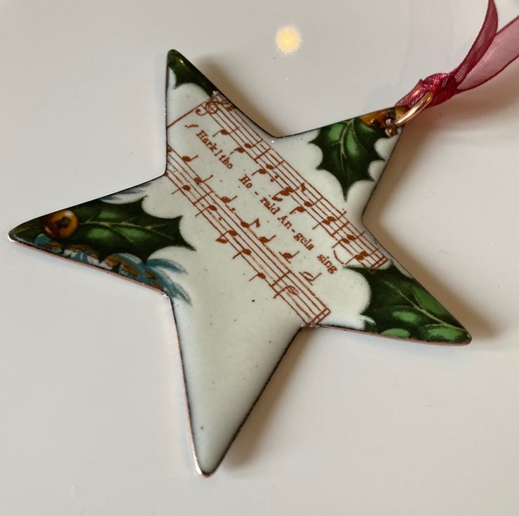 Christmas decoration made from reclaimed copper and enamel. This star is ivory on the front and decorated with images of holly leaves and a fragment of the carol ‘Hark the Herald Angels Sing’ in sepia tone print. It's green on the back, measures 65mm in height and is suspended from a burgundy coloured voile ribbon