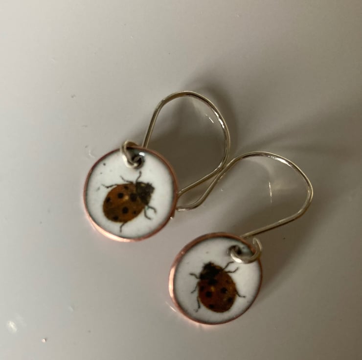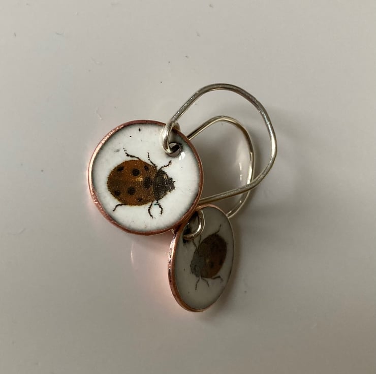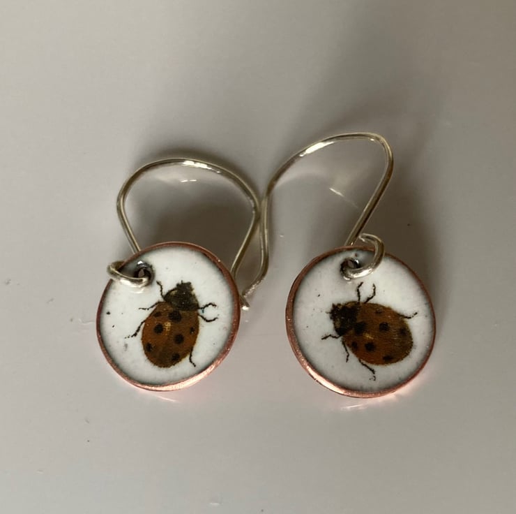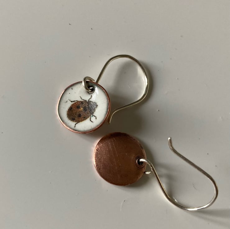 Ivory coloured enamelled copper earrings, featuring images of ladybirds. The earrings are slightly concave, with natural copper backs and are suspended from hand-made sterling silver earring wires