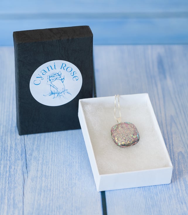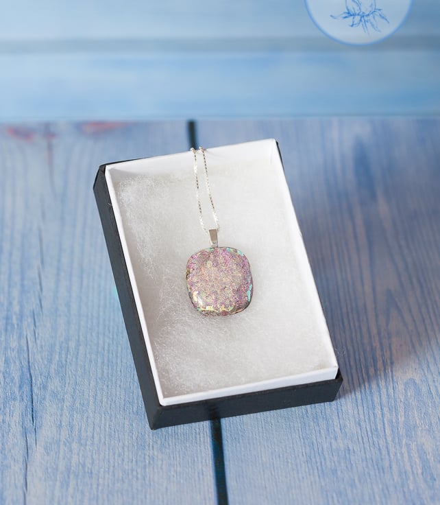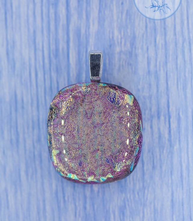 These are made by fusing glass together in a kiln. We have a base layer, dichroic layer and a clear top layer to cap it. It has a sterling silver bail attached to it.