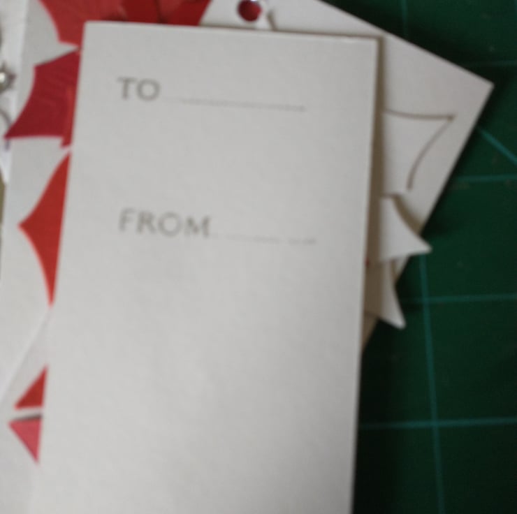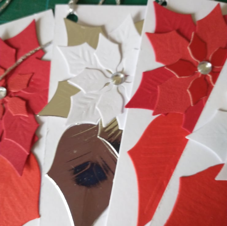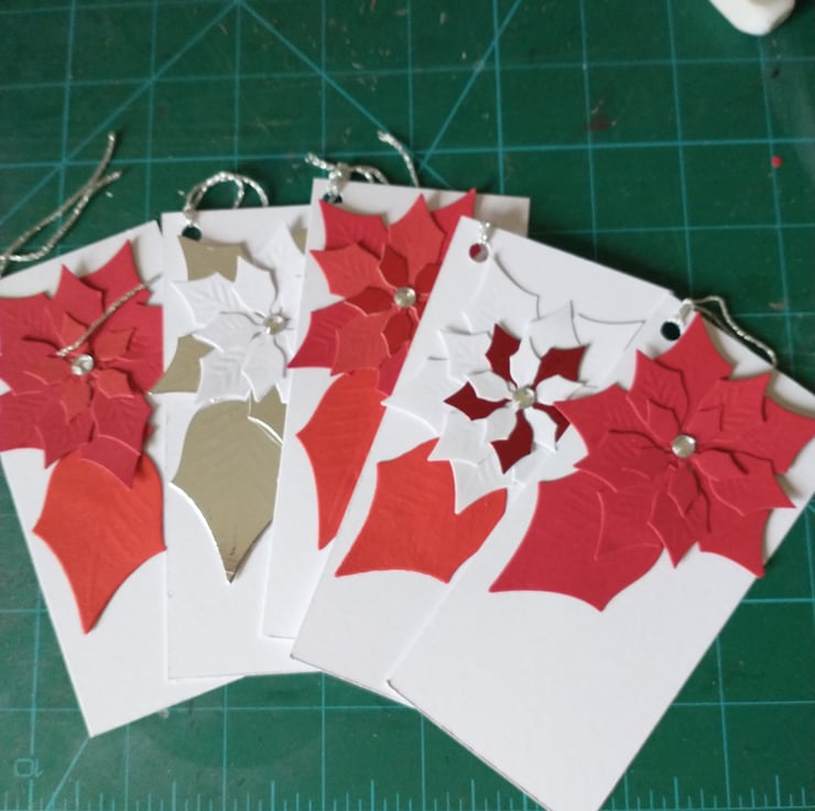 Completely handmade and uniquely designed pack of 5 gift tags. Poinsettia and leaf die cut from quality card. Same design, varied colourway. Silver cord for attaching to gift.