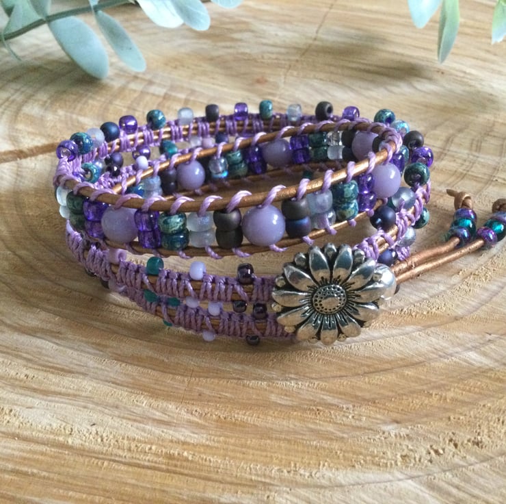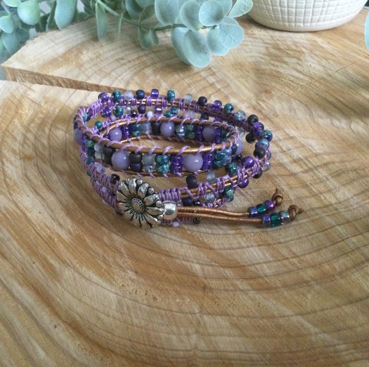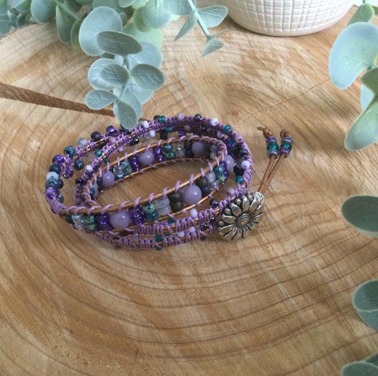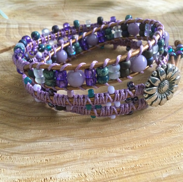 "Lilac Dreams" Boho wrap beaded leather bracelet.