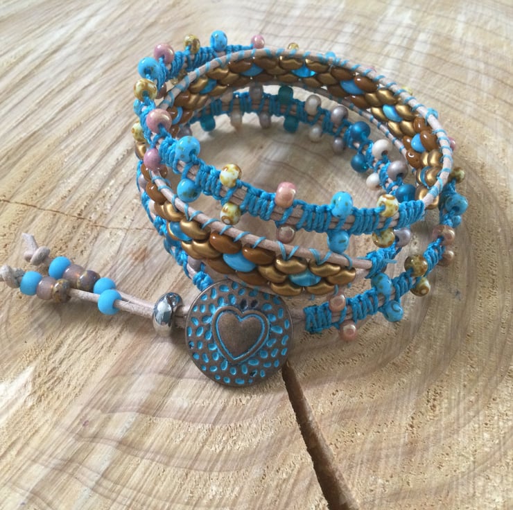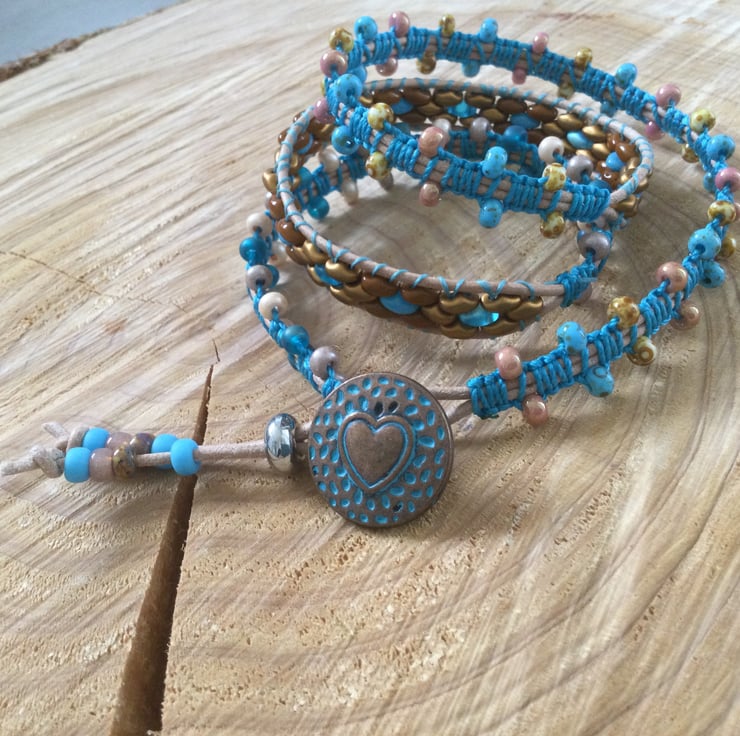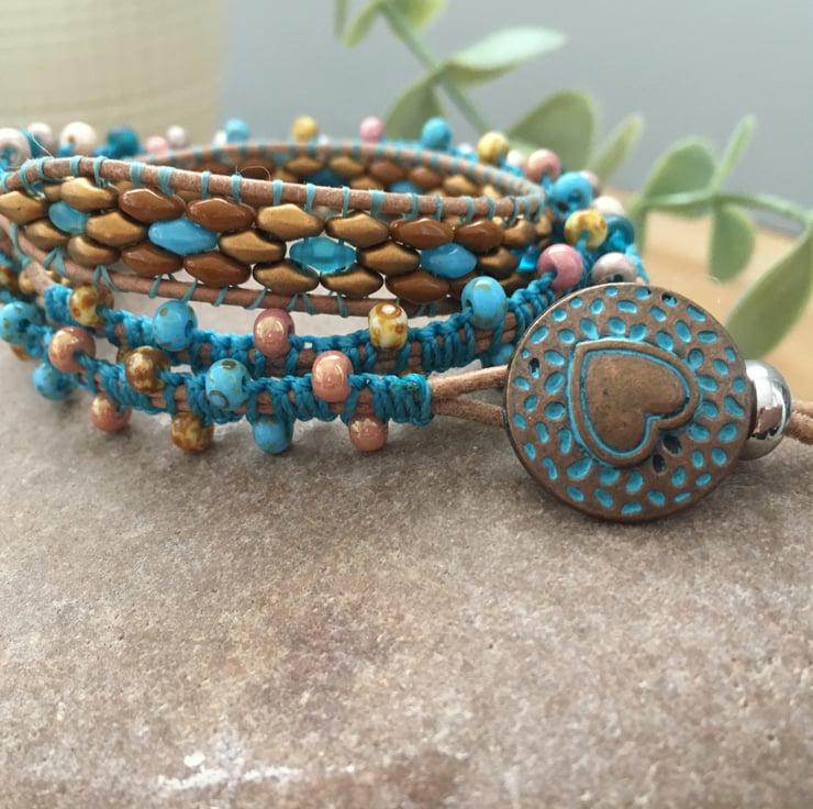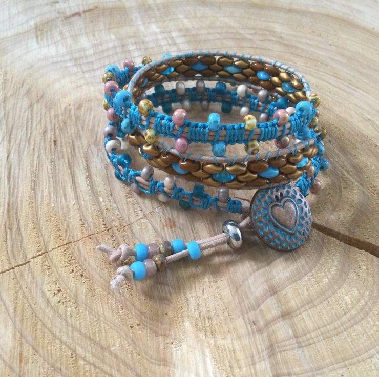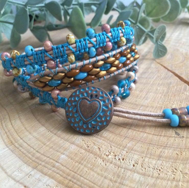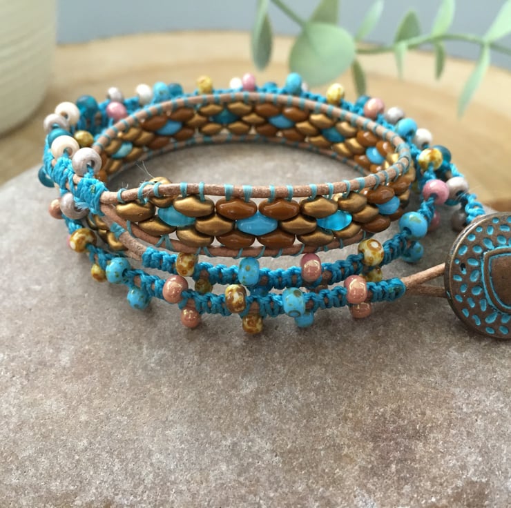 The first and last section is created using gorgeous Miyuki glass beads woven onto leather soft Italian leather using a macrame stitch. For the middle section I have used super duo beads and attached to the leather using a ladder stitch all in beautiful shades of turquoise blue, gold, natural and creams.