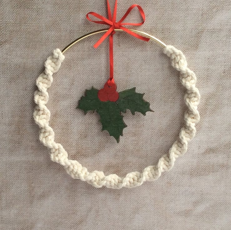 This beautiful Holly Macrame Wreath has been handmade using 100% natural unbleached cotton rope and completed with a festive red ribbon and hand painted holly.
