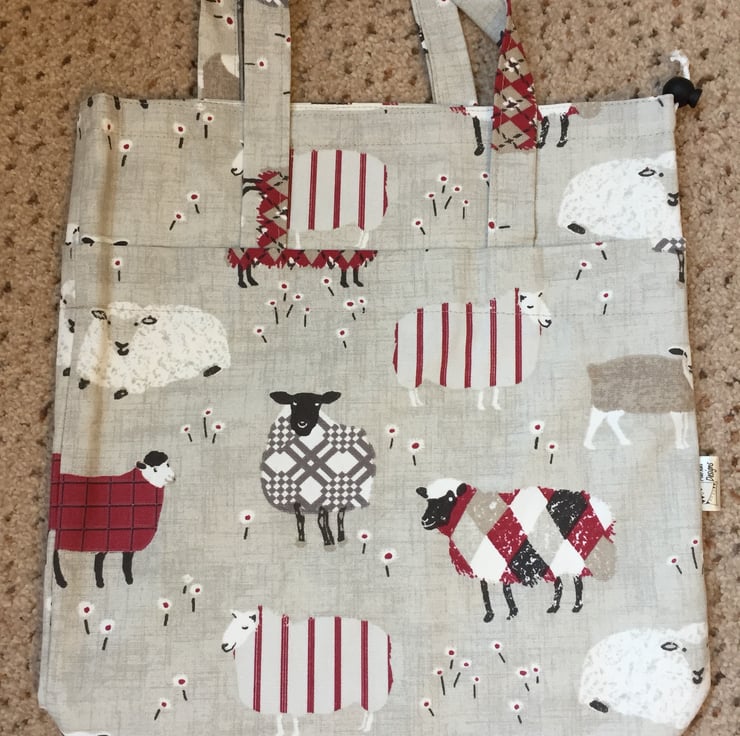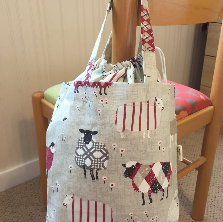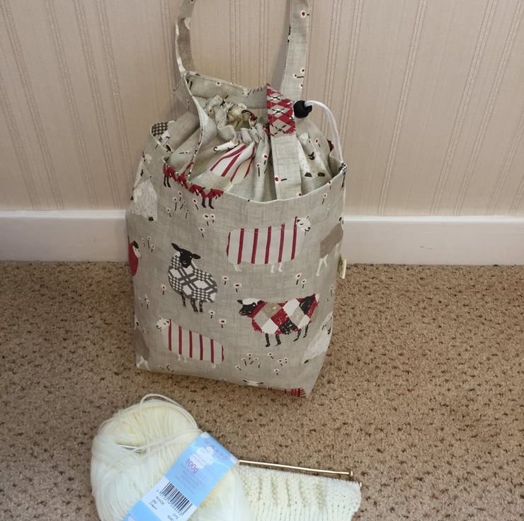 Looking for something to carry your knitting or crotchet around in? Then this knitting bag should solve all your problems, handmade in this delightful heavy cotton sheep fabric with a poly/cotton lining. It has a drawstring top to keep your work free from dust and has two carrying handles. The lining has 3 narrow pockets on one side for storing needles etc and 2 larger pockets on the other side. Lining colours may vary.