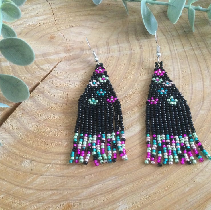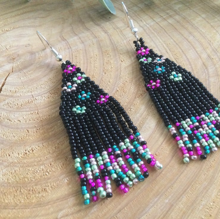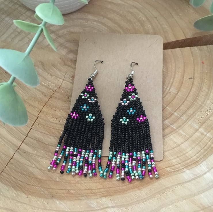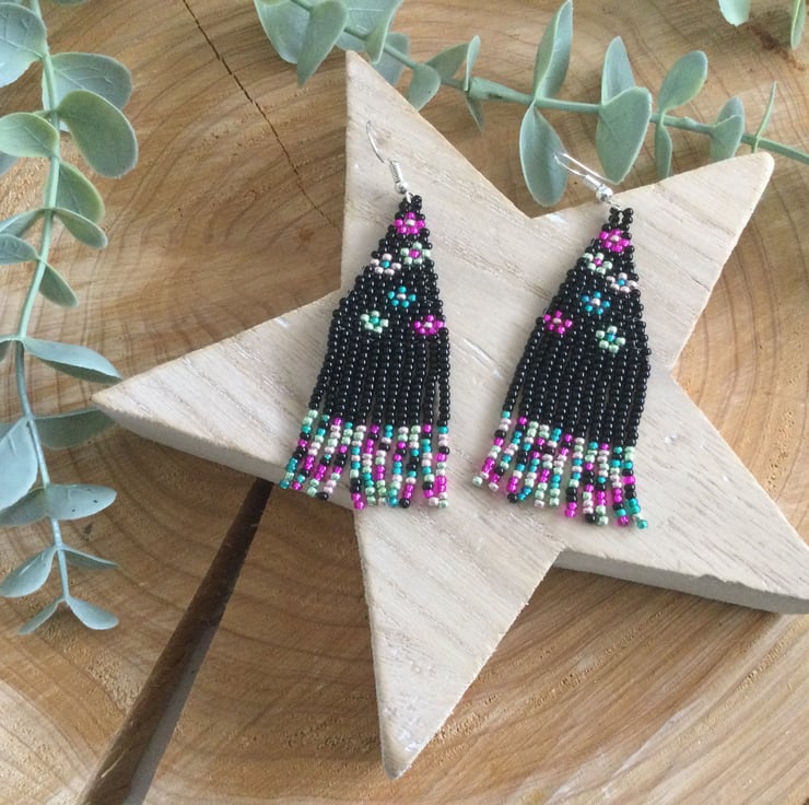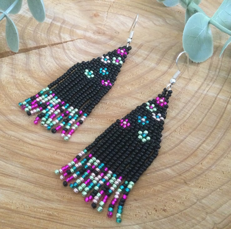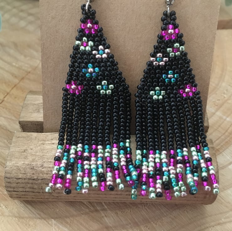 Created using tiny glass Miyuki seed beads the coloured flowers really pop on a black background. The same coloured beads have been used in the fringe.
