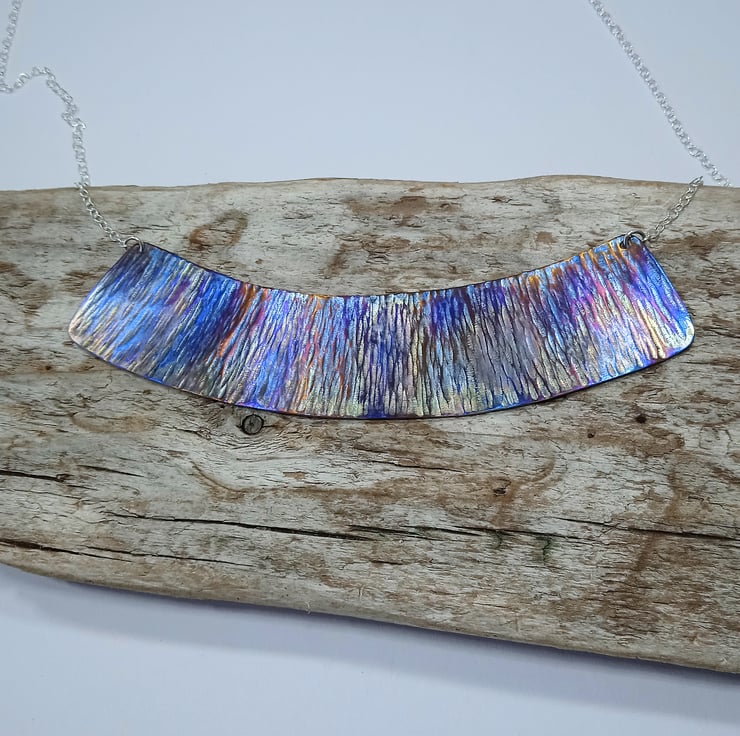 This titanium necklace displays a range of attractive shades which really come to life when it catches the light.