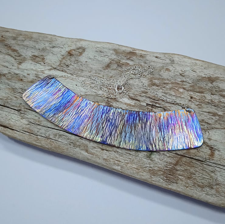 I have made this necklace by hand sawing the shape from titanium sheet and have given the surface an attractive hammered finish before heat colouring. I have then attached sterling silver chain to create the necklace.