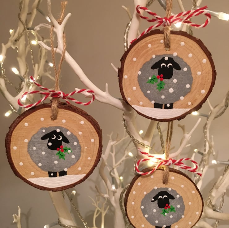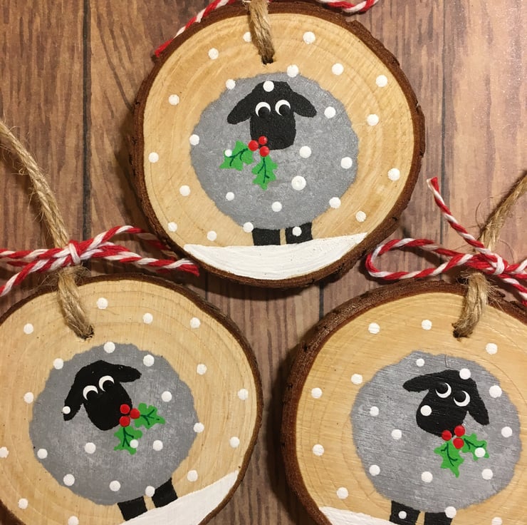 A set of 3 wood slice christmas tree decorations featuring a cute sheep in a festive snow storm.