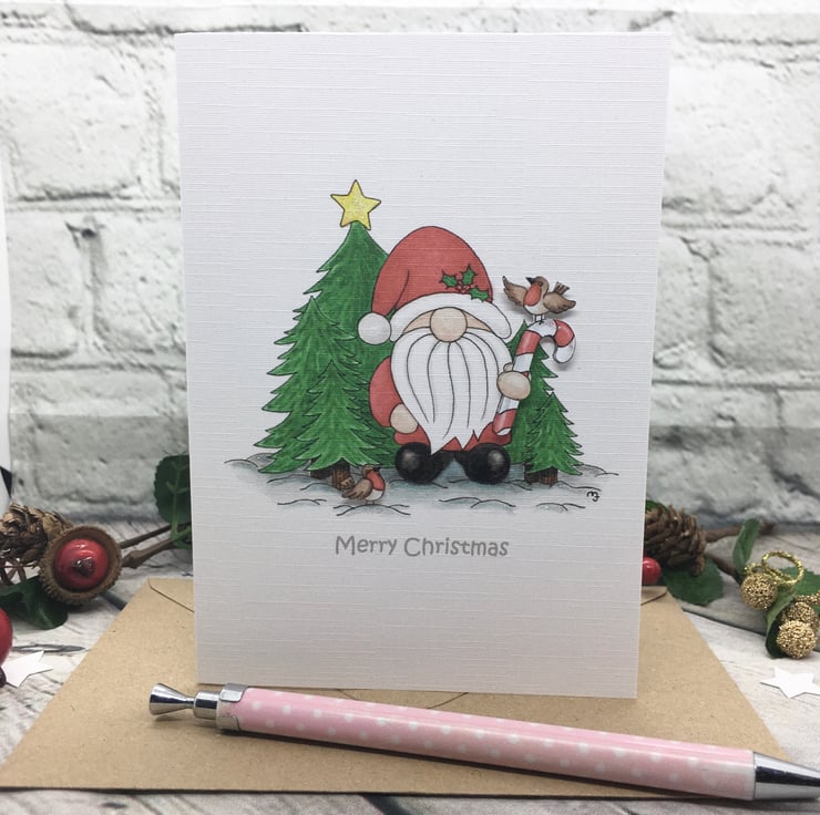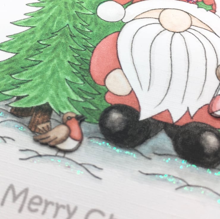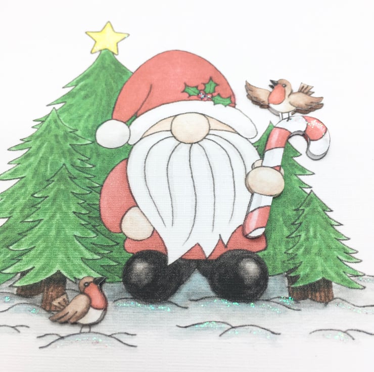 This cute Christmas Gnome card has been designed using my own original watercolour illustration. The card has been printed out onto good quality linen embossed card. The card has been decoupaged up in parts and finished off with a little glitter detail.