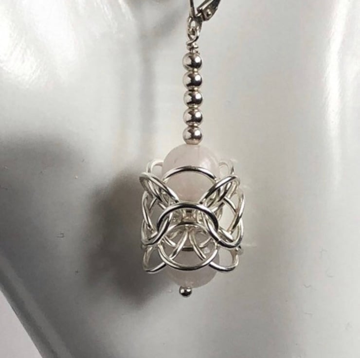 The Sterling Silver rings have been linked into this stylish intricate Turkish Chainmaille weave, encasing two Rose Quartz gemstones in each earring with five sterling silver rounds leading to the gemstones
