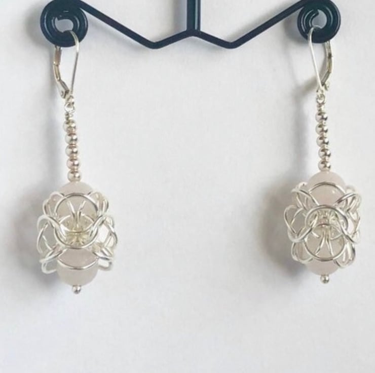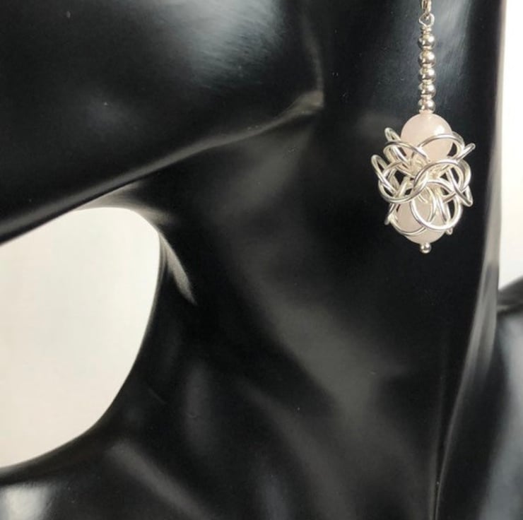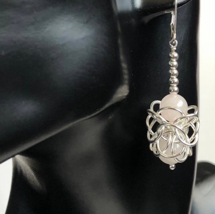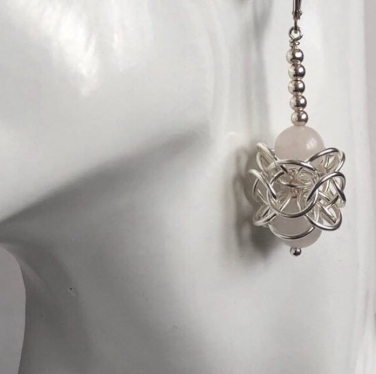 The Sterling Silver rings have been linked into this stylish intricate Turkish Chainmaille weave, encasing two Rose Quartz gemstones in each earring with five sterling silver rounds leading to the gemstones