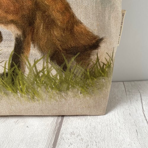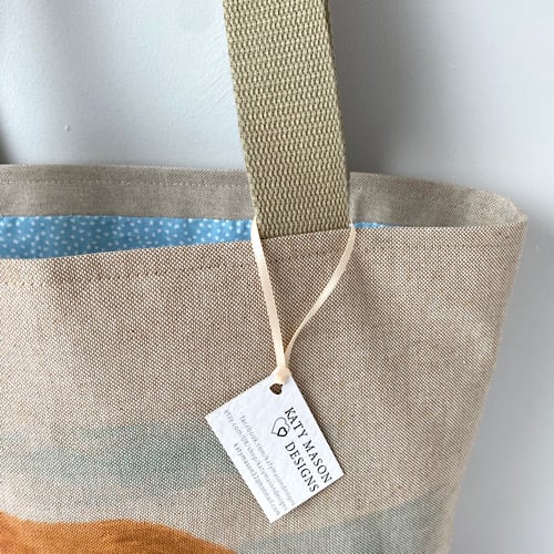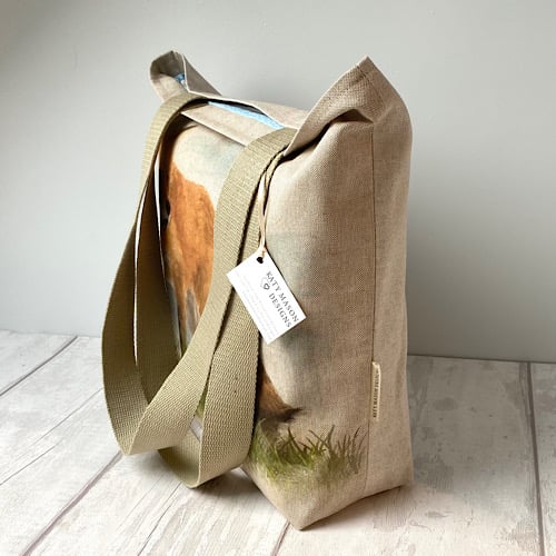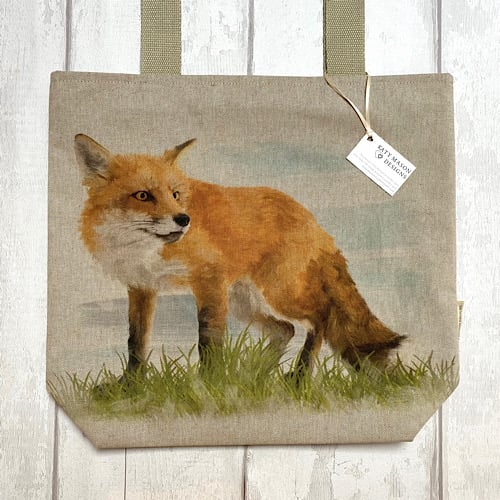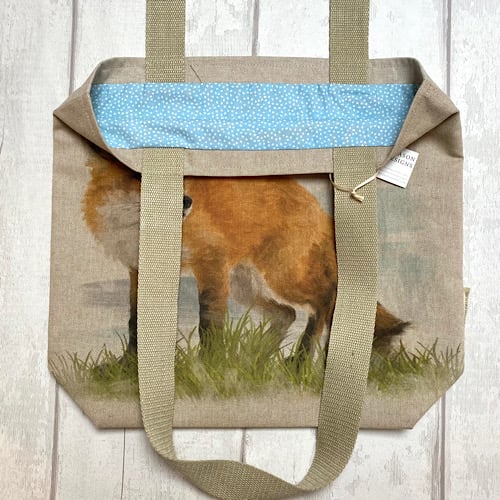 Long handled tote bag with a beautiful fox print. Fully lined in blue spot fabric with an inside pocket and webbing handles. 35cm wide, 38cm high, 12cm deep.
