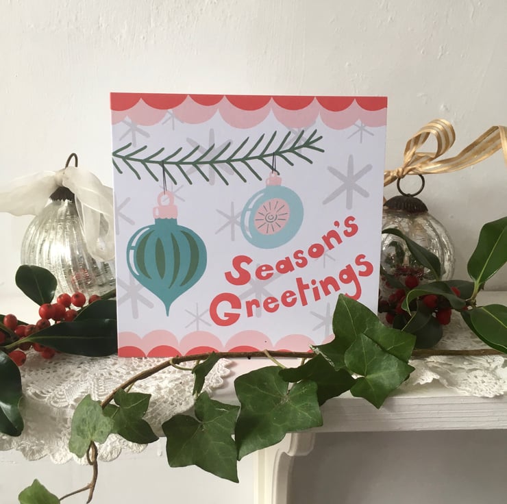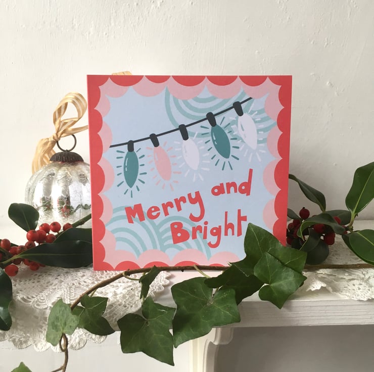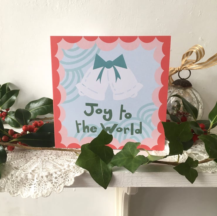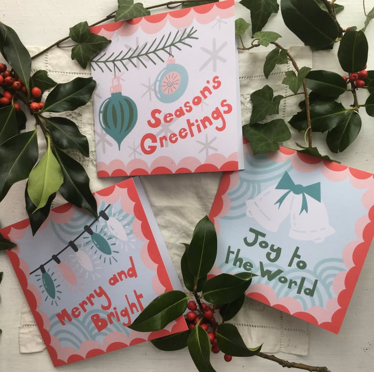Set of three square Christmas cards with envelopes. There are three different vibrant, contemporary designs in this set, ‘Season’s Greetings’, ‘Joy to the World’ and ‘Merry and Bright’.