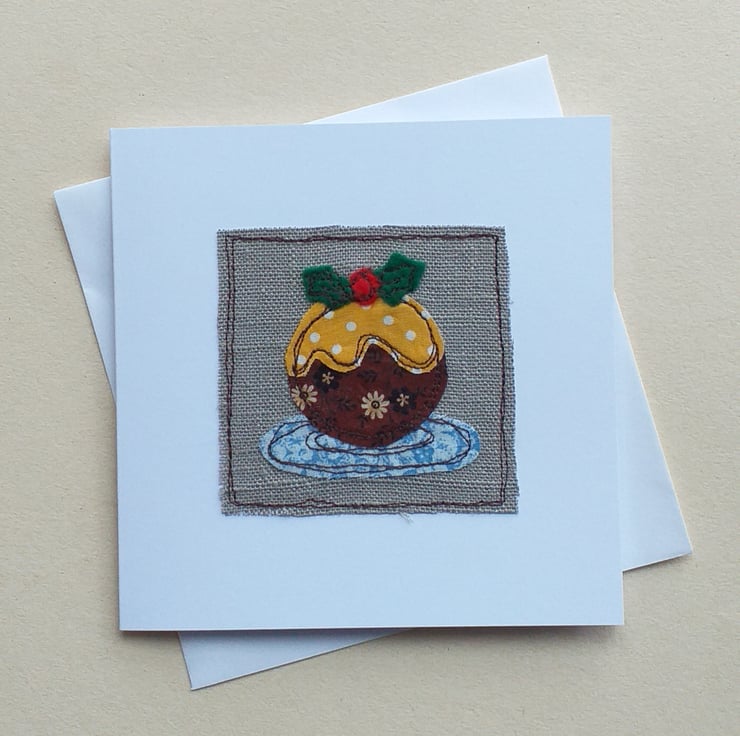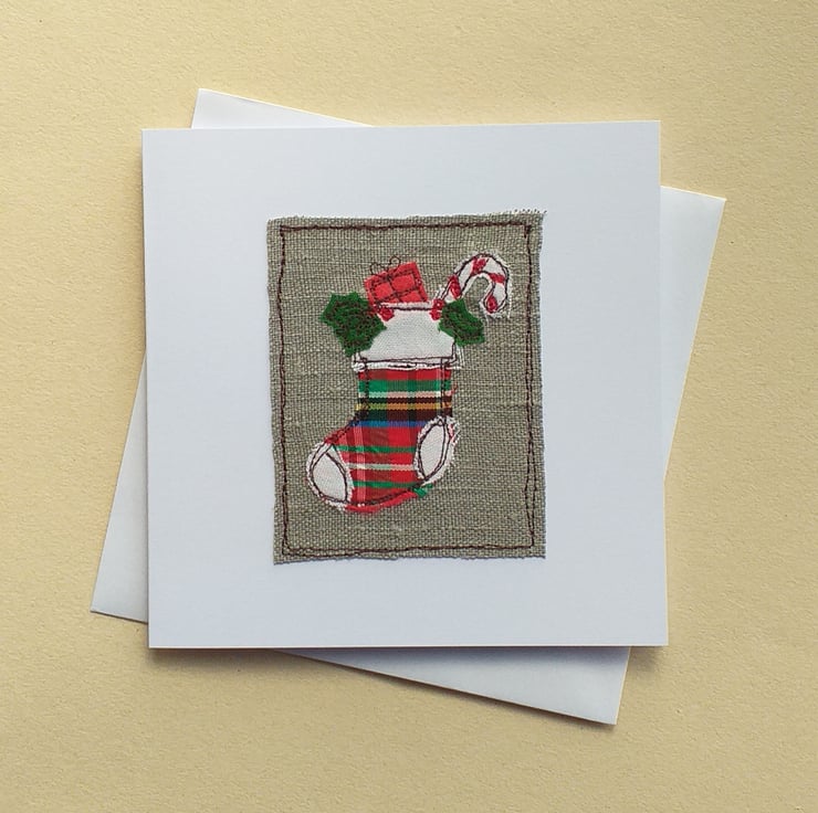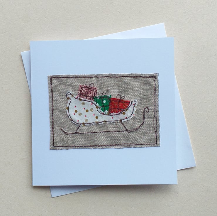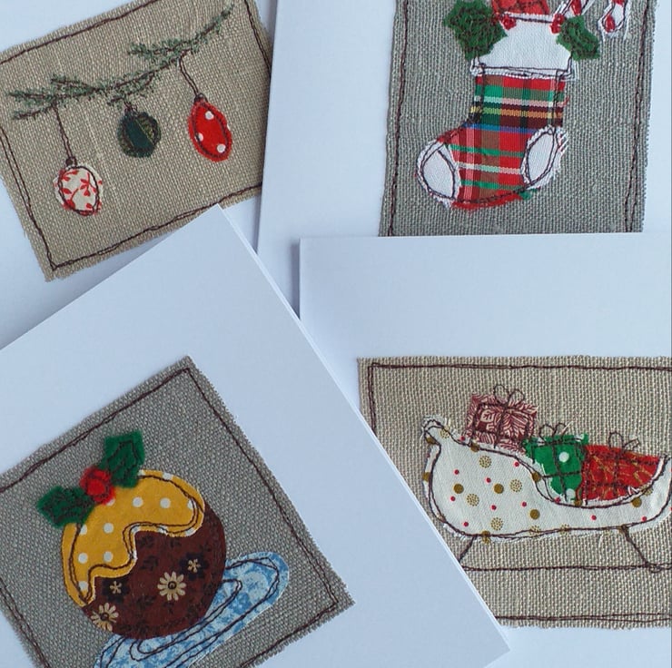 A set of 4 different Christmas cards containing one each of four designs: a Christmas pudding on a plate, a stocking filled with presents and candy canes, a pine branch with 3 hanging baubles and a sleigh full of presents. Each design is made with fabric appliqued onto linen using free motion embroidery.