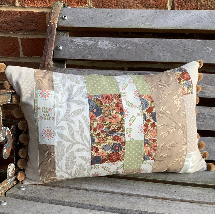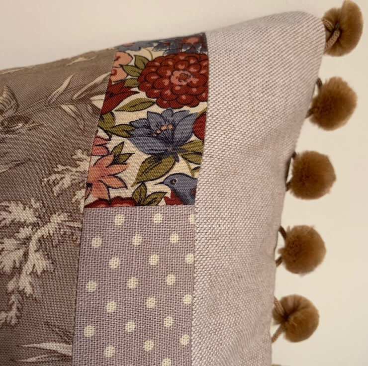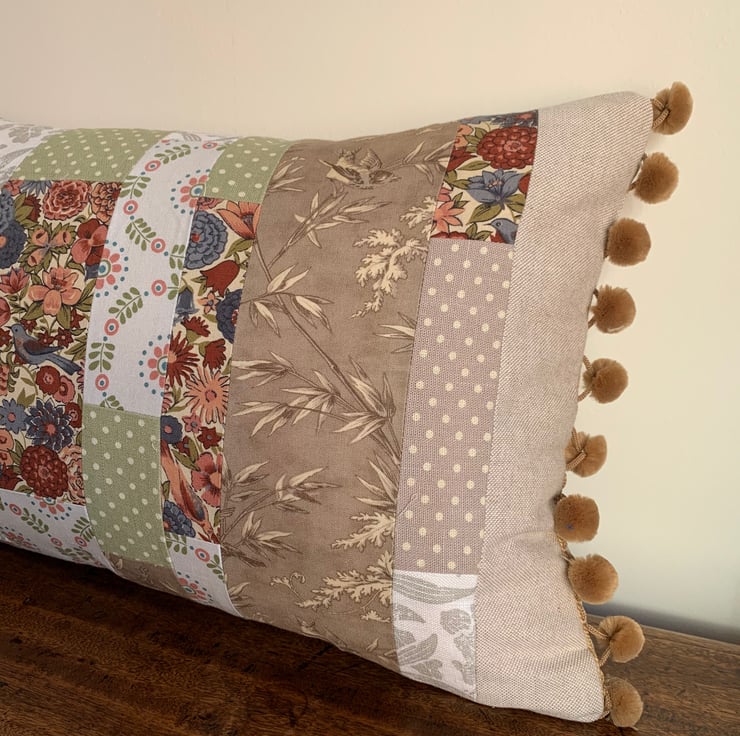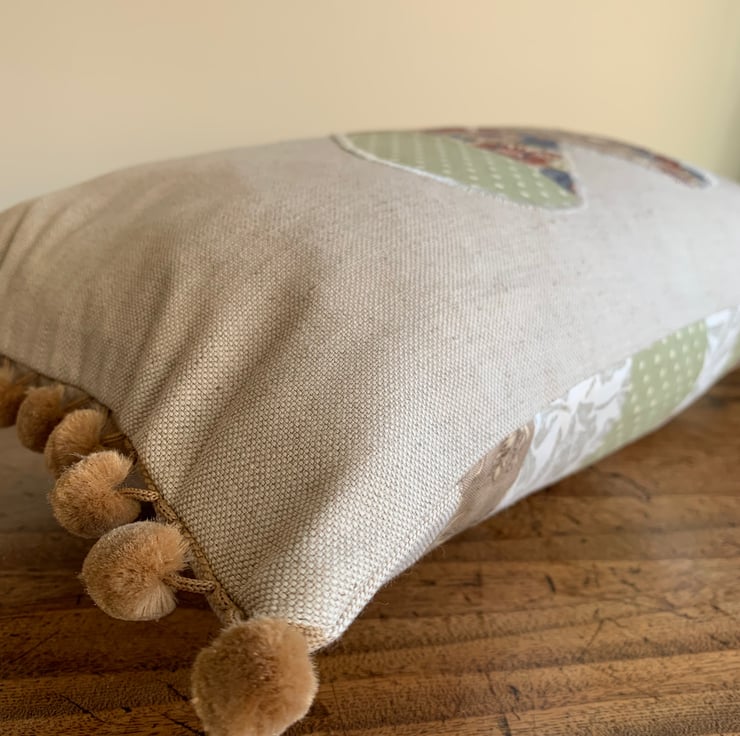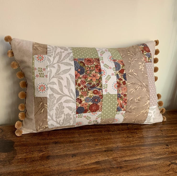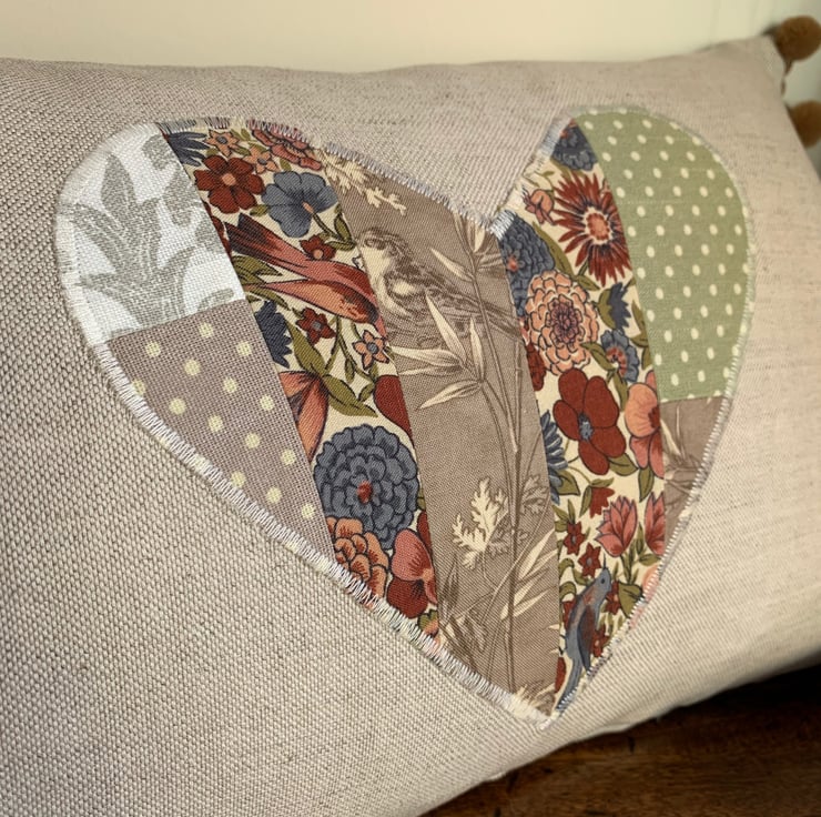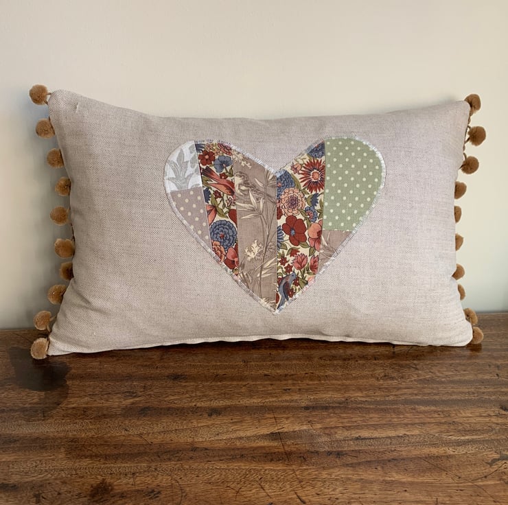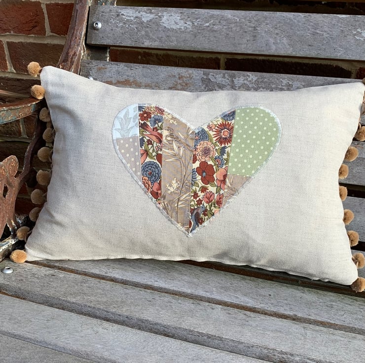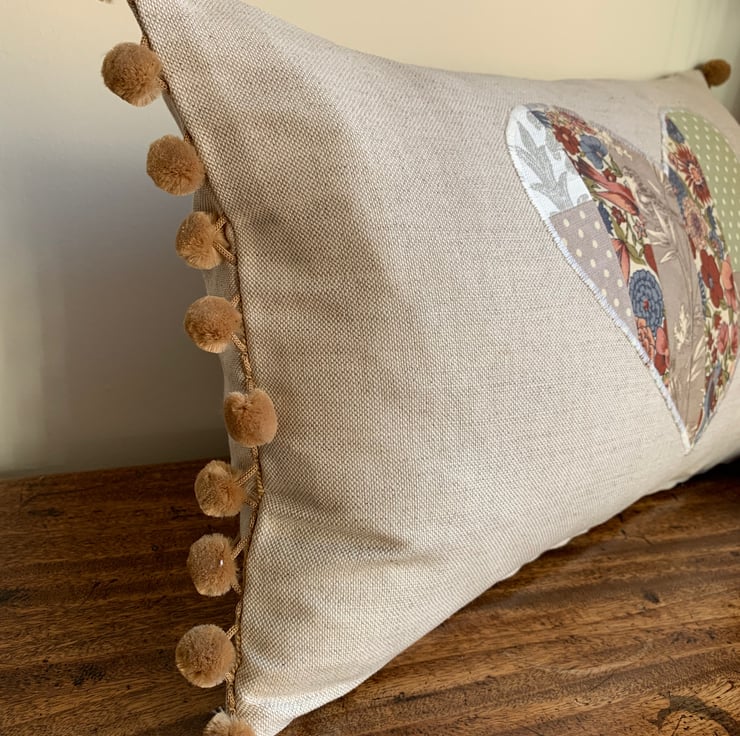 One of a kind cushion cover using up small pieces of leftover fabric and teaming them with oatmeal linen. One side is oatmeal linen with a patchwork heart appliqué. The other is a patchwork of the different fabrics. The ends of the cushion are trimmed with velvety straw coloured pompoms.