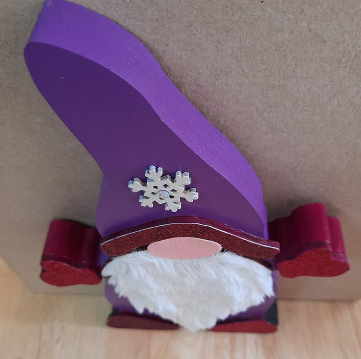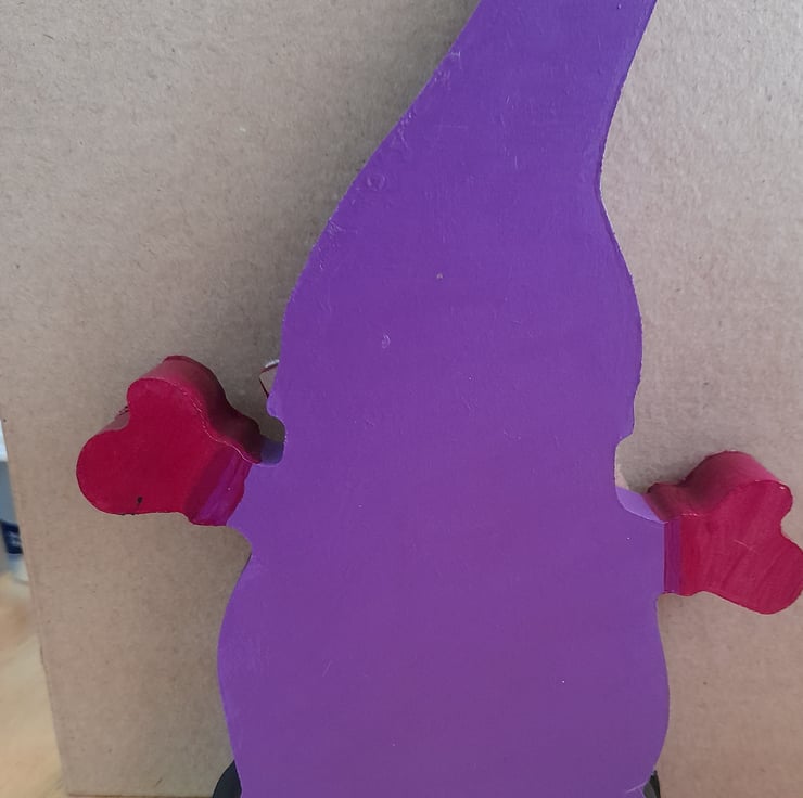 This Elf is made of wood that has been decorated with acrylic paint , faux leather and sparkle.