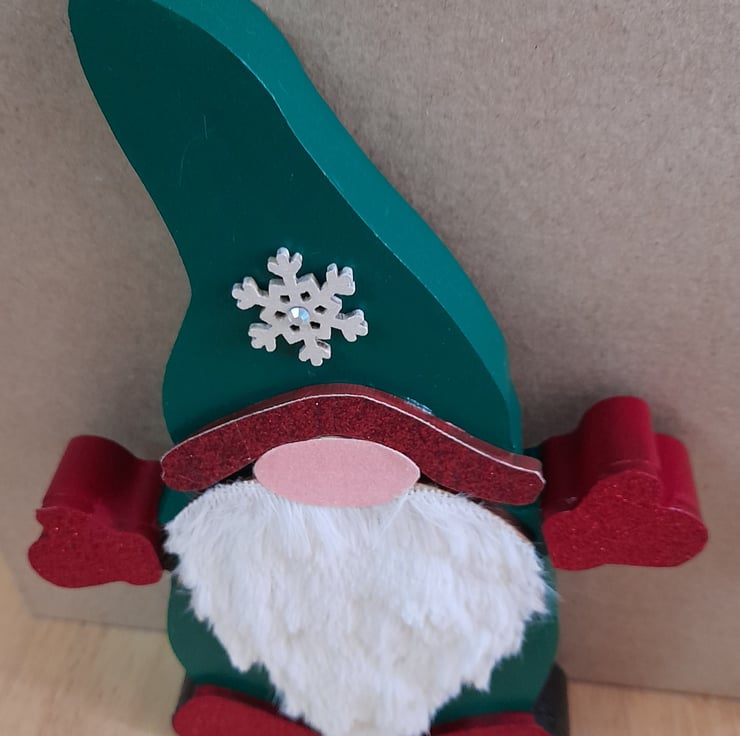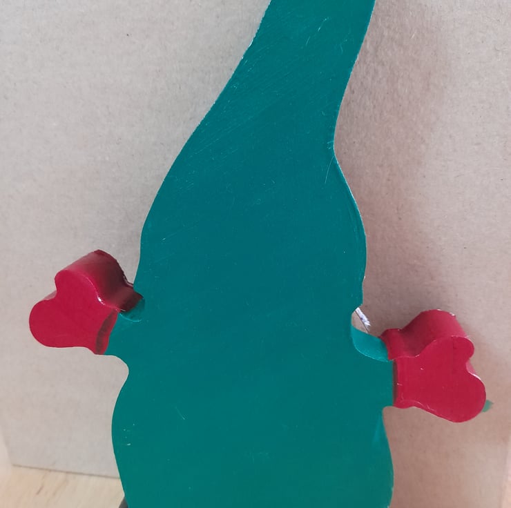 This Elf is made of wood that has been decorated with acrylic paint , faux leather and sparkle.