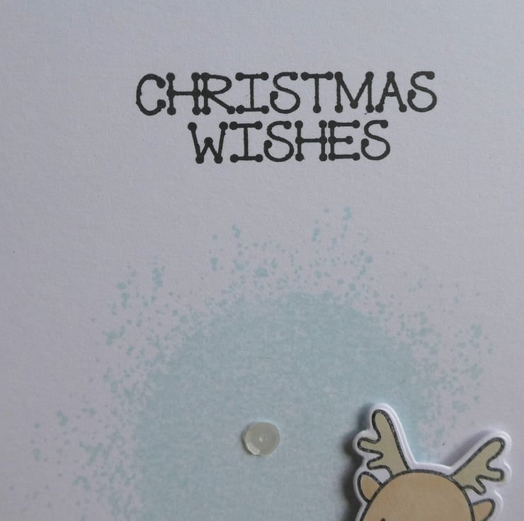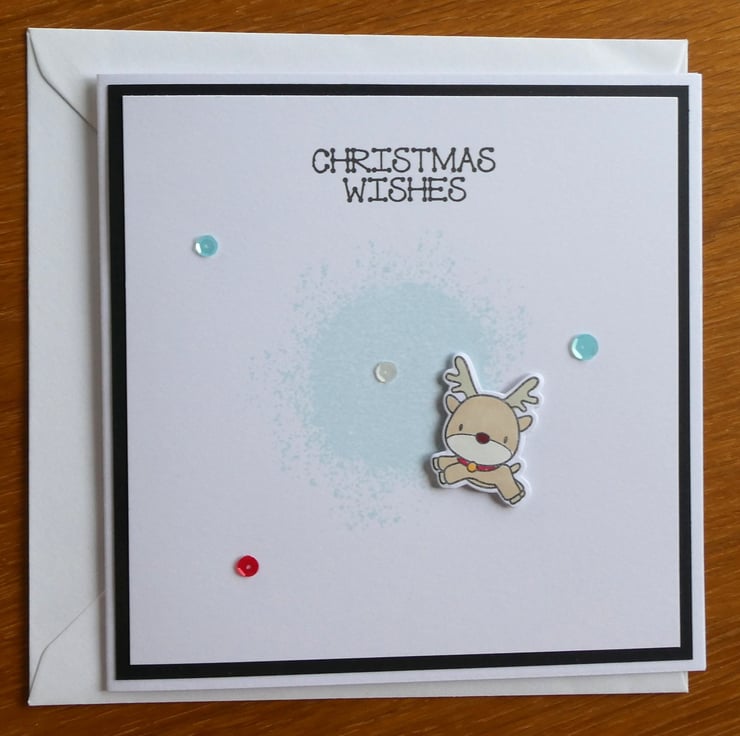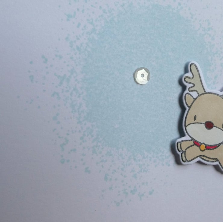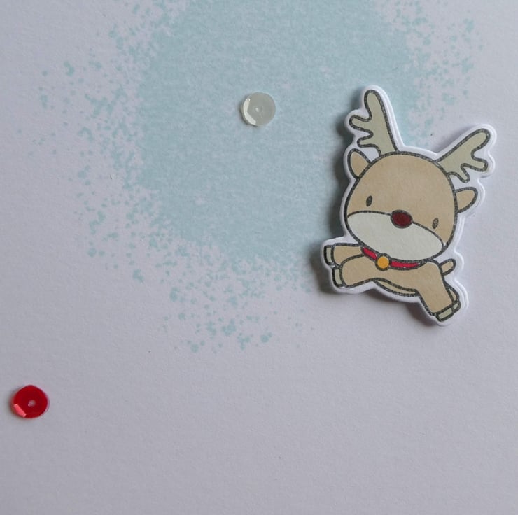 It features a cute reindeer with a dark brown nose, red collar and gold bell, jumping with Christmas joy! He has been slightly raised above a pale blue 'splash' background.