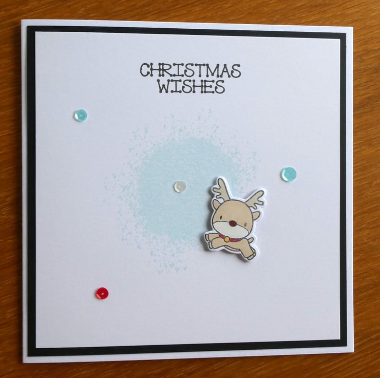 The message Christmas Wishes has been stamped in black archival ink at the top and the design has been finished with a scattering of sequins in aqua, red and white.