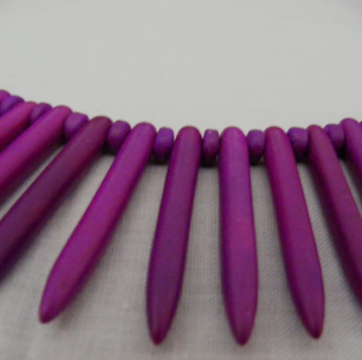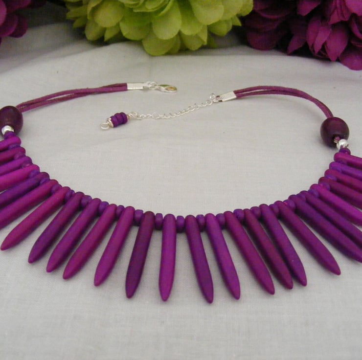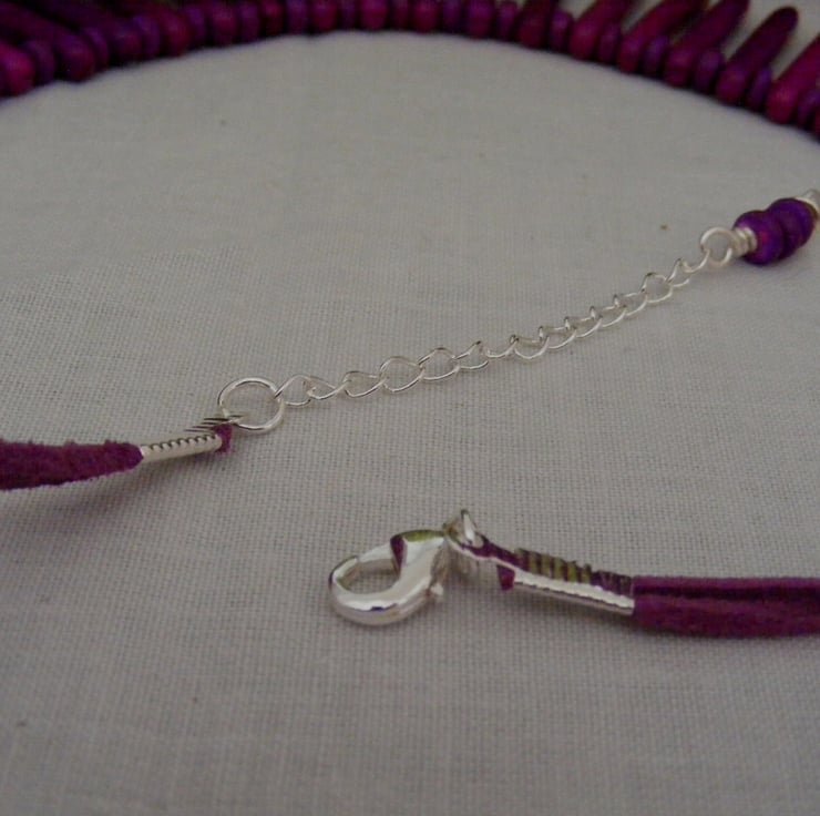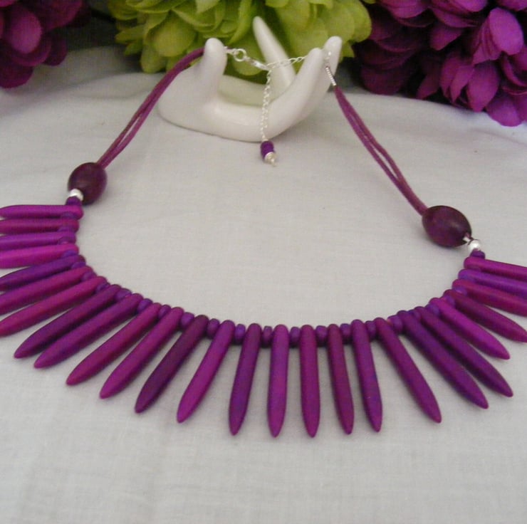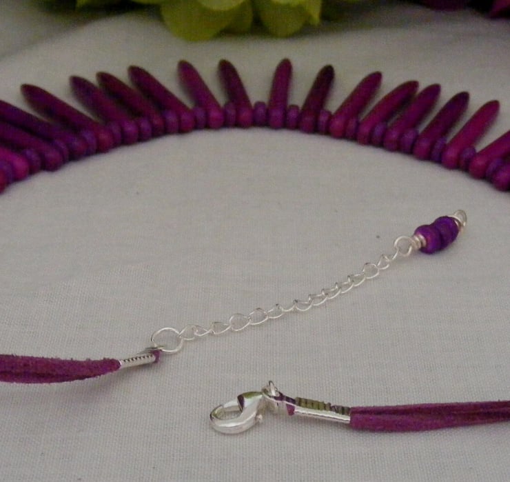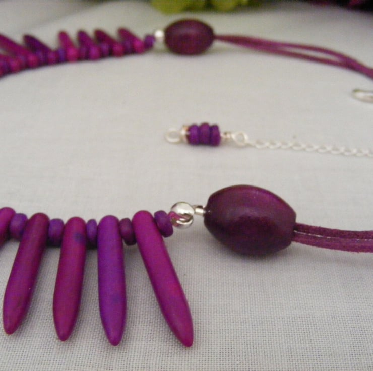 Gemstone necklace is handmade with, 40 x 4 mm - 30 x 4 mm dark purple howlite tooth beads, 4 mm dark purple wooden rondelles, beading wire, silver plated findings, dark purple suedette, 17 x 12 mm dark purple wooden rice beads and a silver plated lobster claw clasp with extension chain.