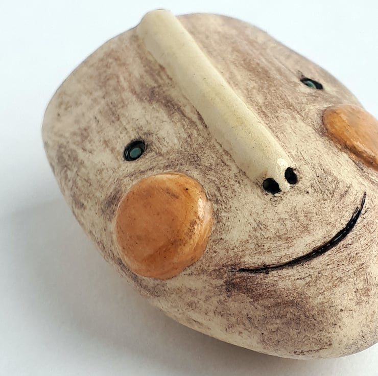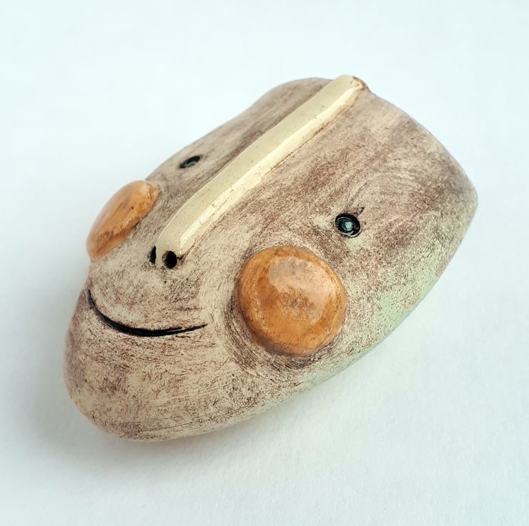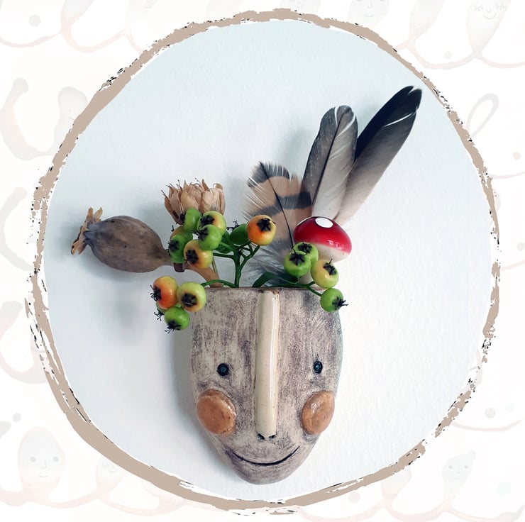 Tiny Treasures is sculpted from a cream coloured earthenware clay and is decorated with oxidesand finished off with a rich clear glaze. A whole in the back of the head allows the ‘Happy Head’ to be hung from a nail on the wall.