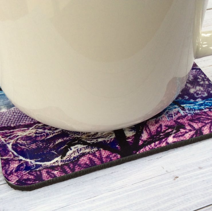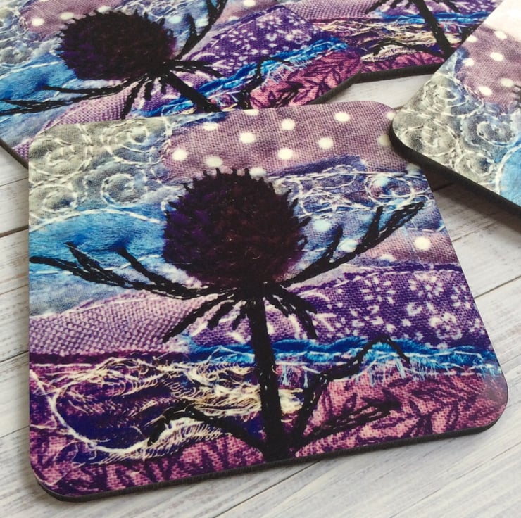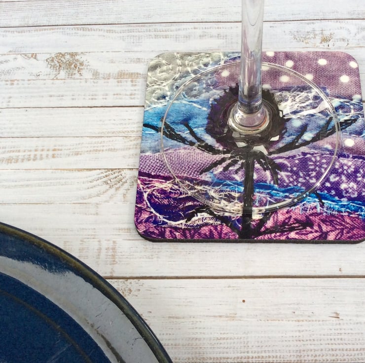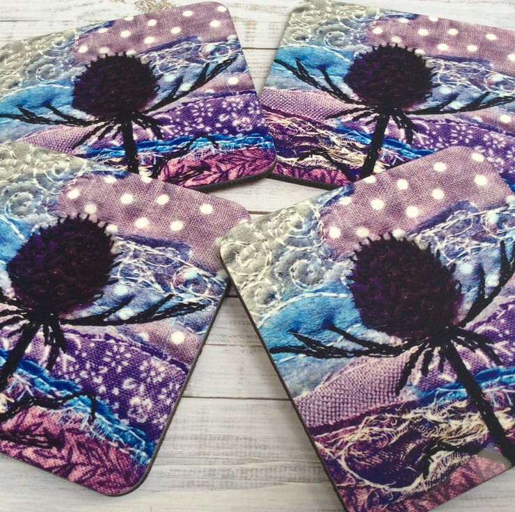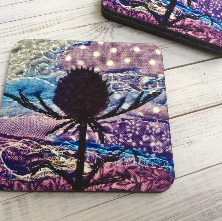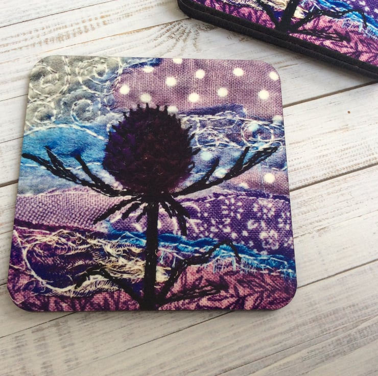 This coaster shows a print of one of my free motion embroidered flowers. This one is a thistle set against a purple patchwork background. It’s one of 7 designs that would enhance any table setting, or just sit under your favourite mug.