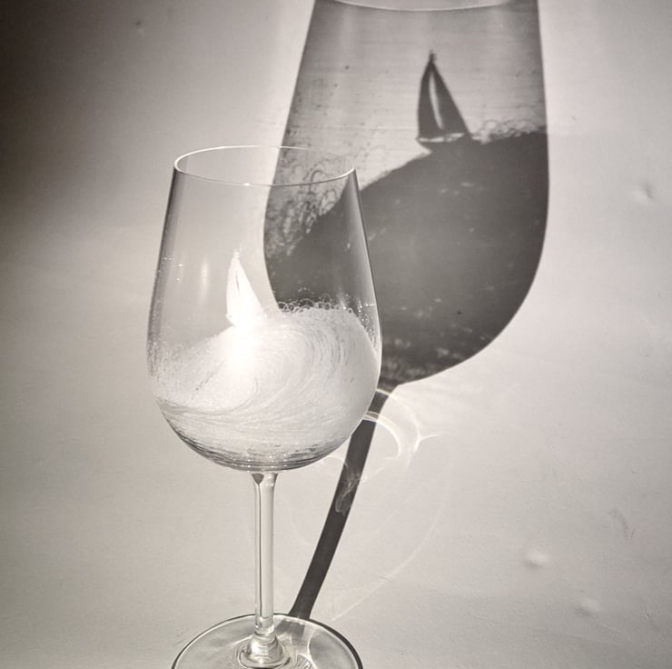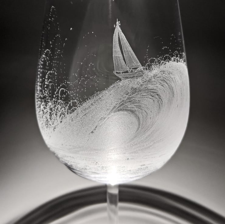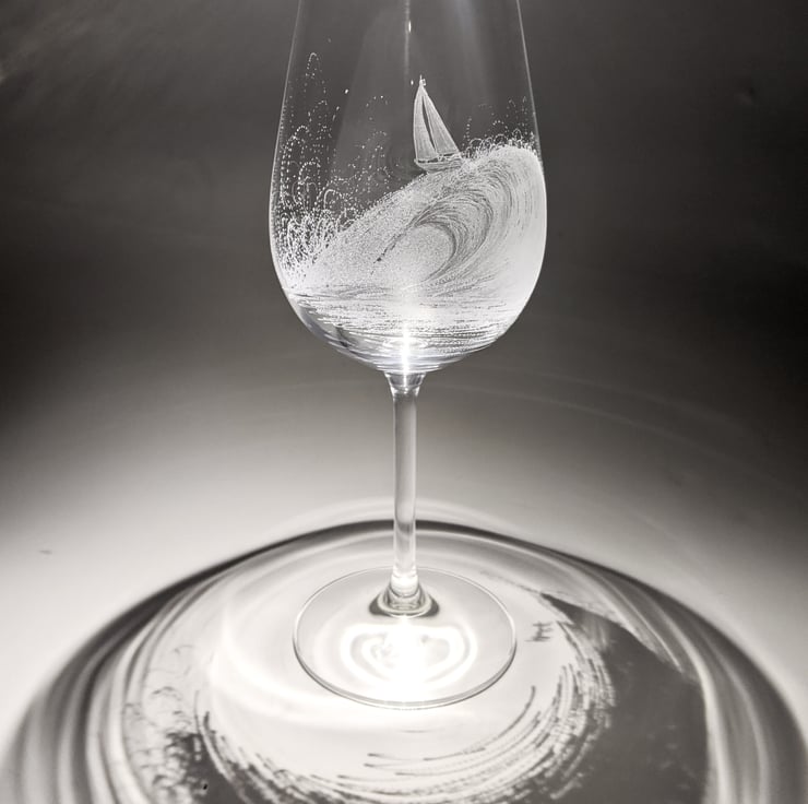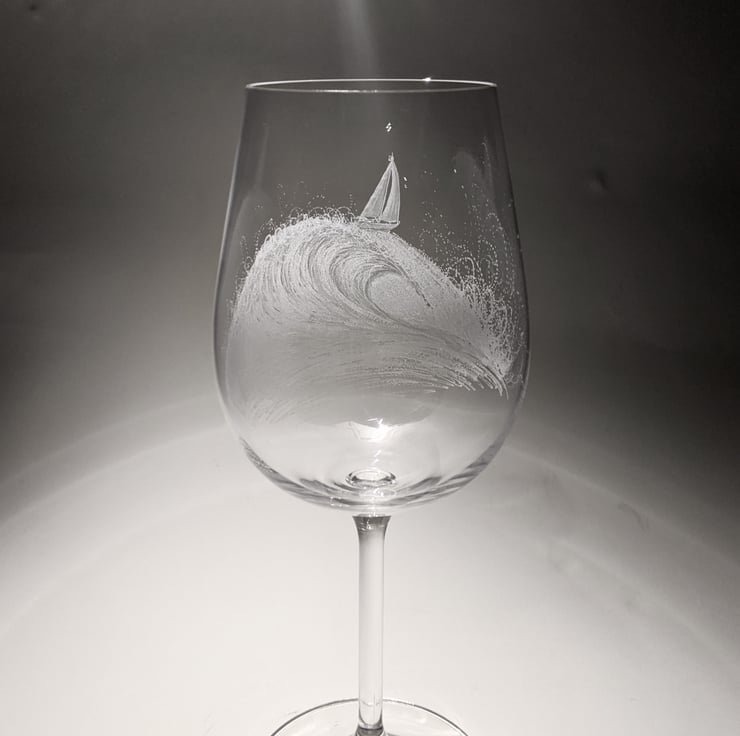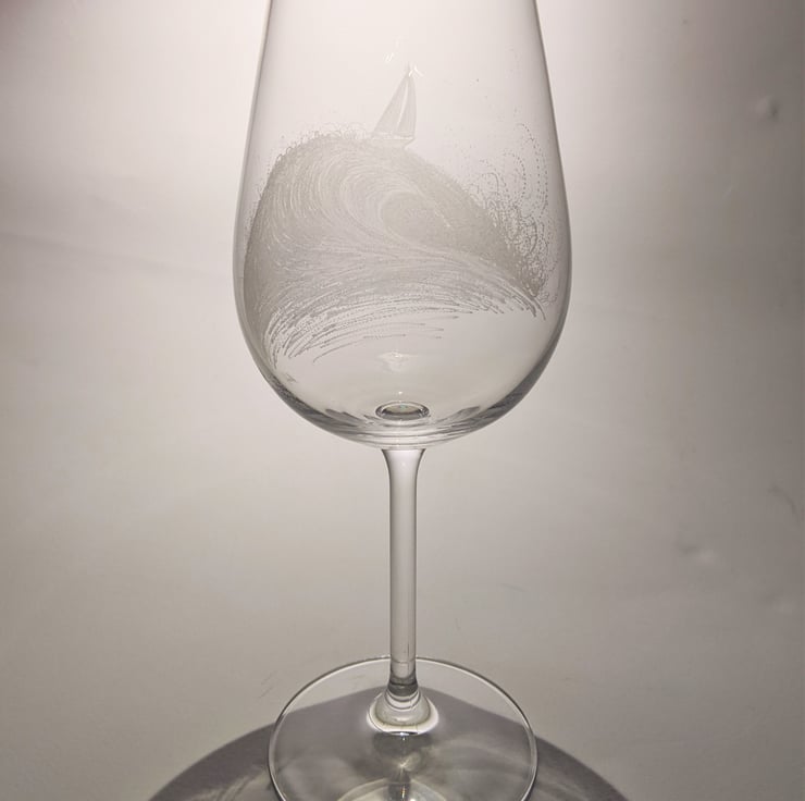 This is a hand engraved wine glass. It is carefully etched with drawing of a sailing boat on top of a big wave, barrelling underneath it.