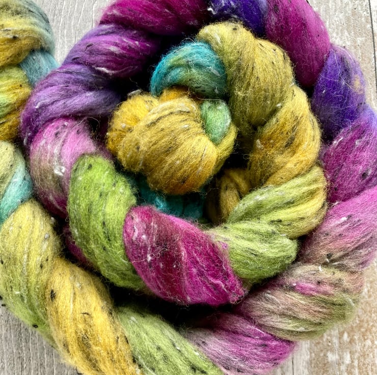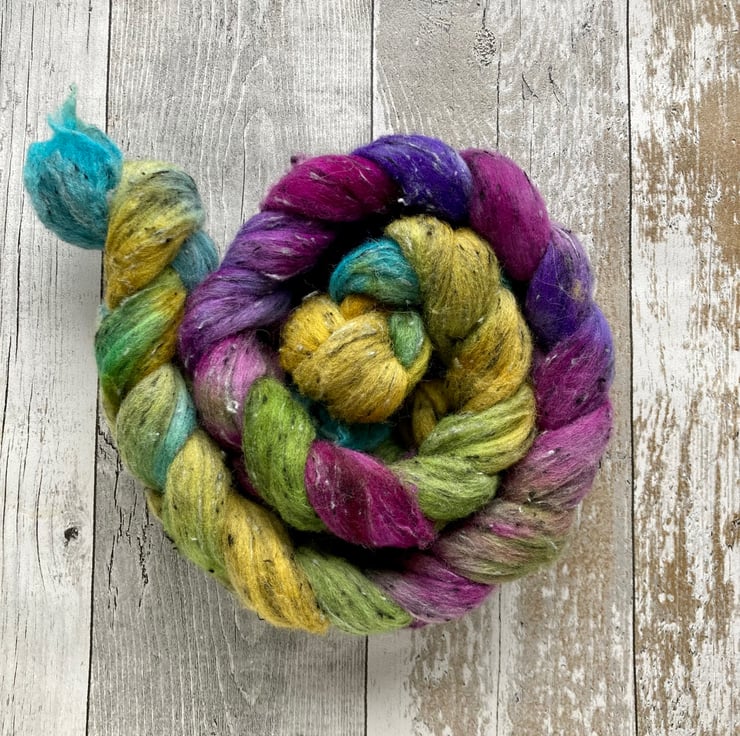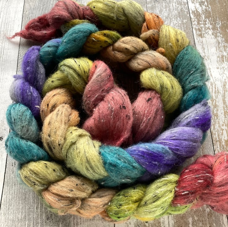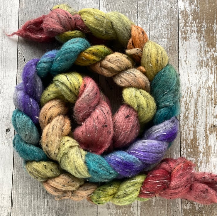 South American wool has a subtle sheen and a lovely volume. Mixed with the viscose it makes a fibre that dyes just beautifully.