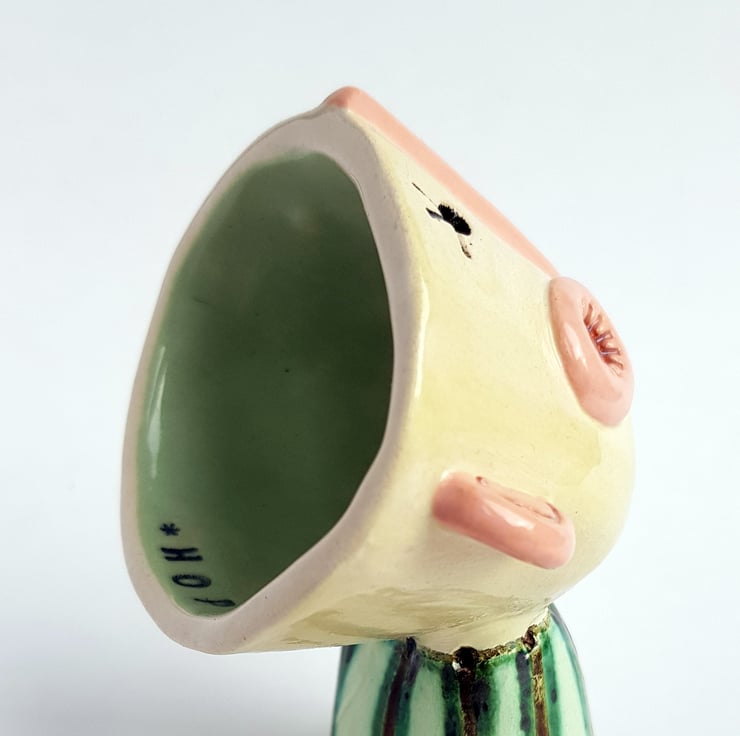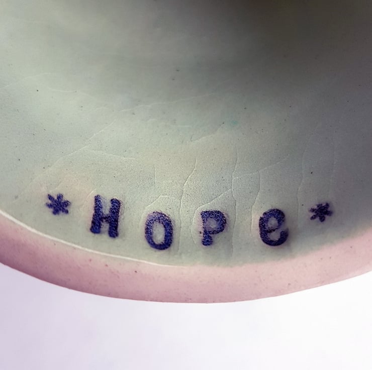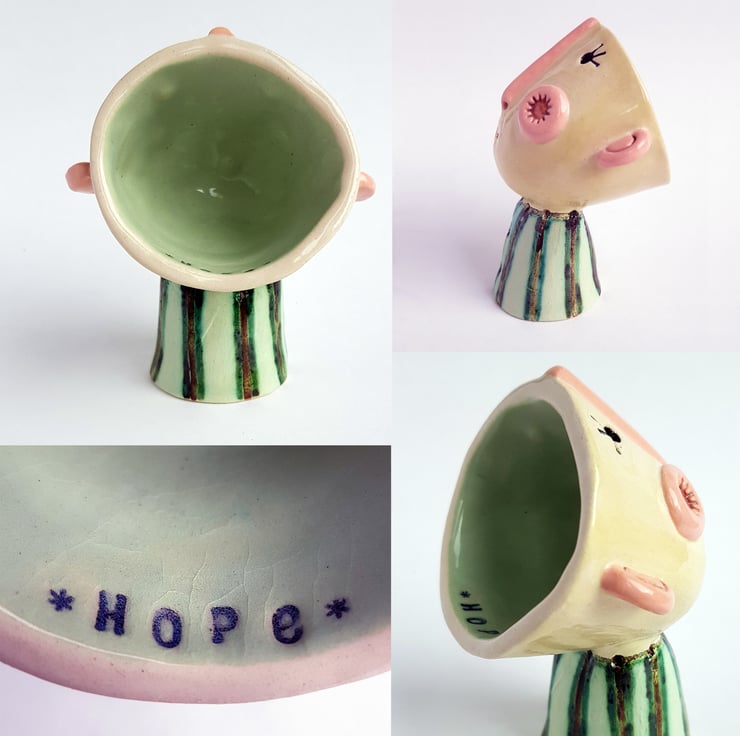 ‘Hopeful Happy’ is sculpted from a cream coloured earthenware clay and is decorated with slips and finished off with a unique sustainably made glaze made from copper scraps .