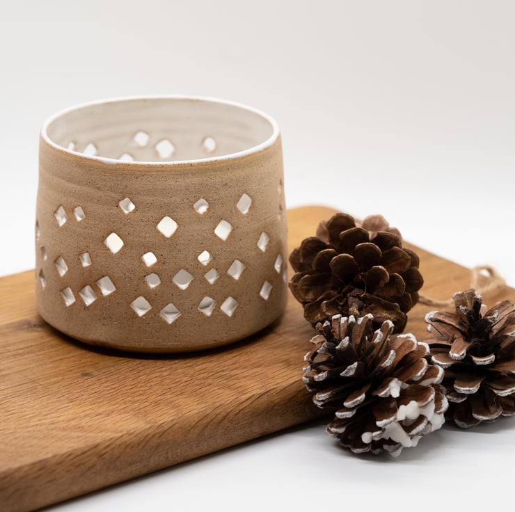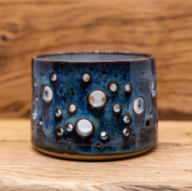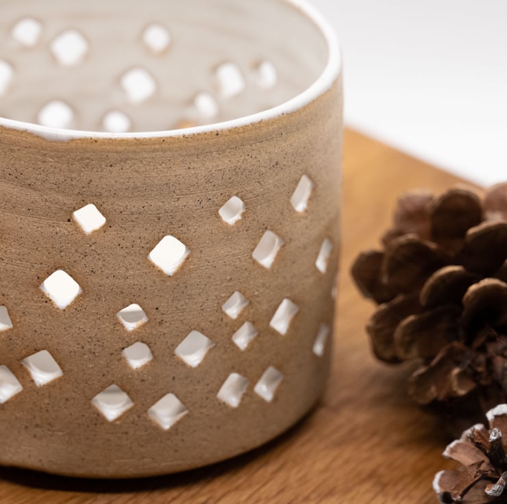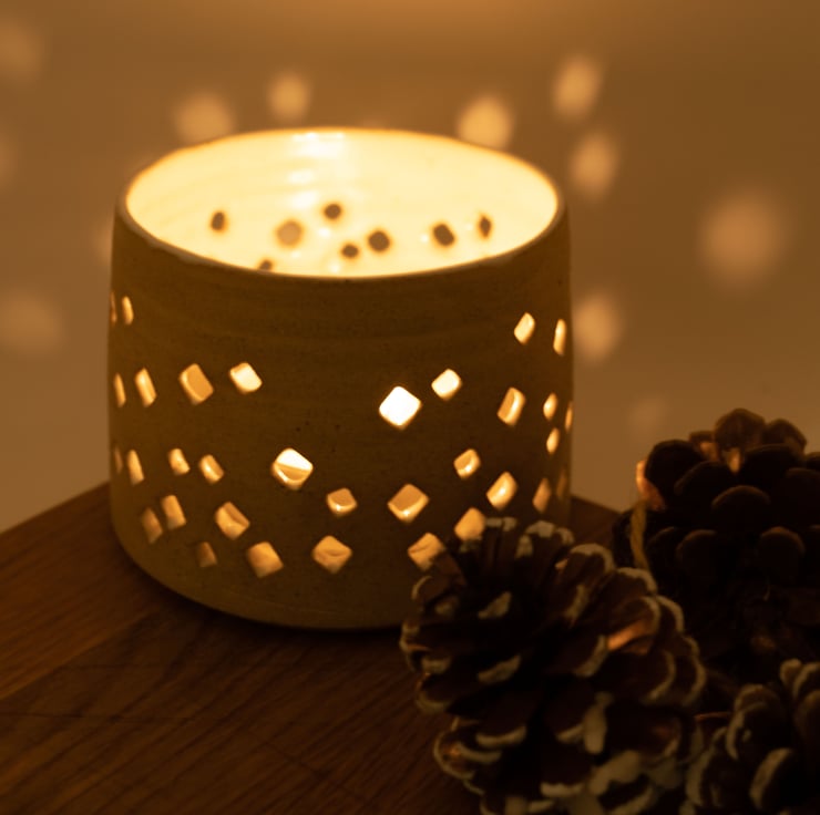 Thrown on the potters wheel in strong stoneware and pierced by hand to produce a sparkly warm glow from a tea light candle.