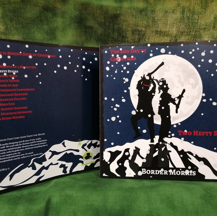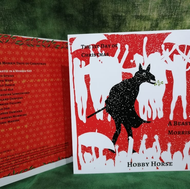 A pack of 12 cards celebrating the traditional 12 Days of Christmas song through different styles of Morris dance and related activities. These cards cover Border Morris, North West, Molly, Yorkshire Longsword, Garland Dancing, Cotswold, Solo Jig and Rapper Dancing. Also Hobby Horses, Mummers' Plays, Musicians and, naturally, Five Pints of Ale. The full song is printed on the back of each card for you to join in with.