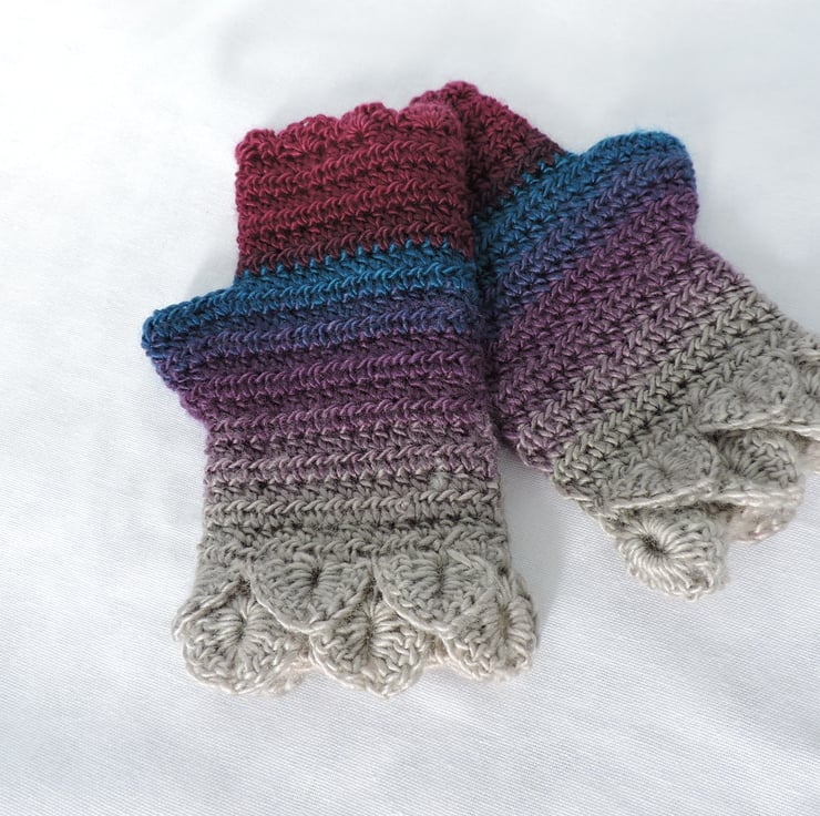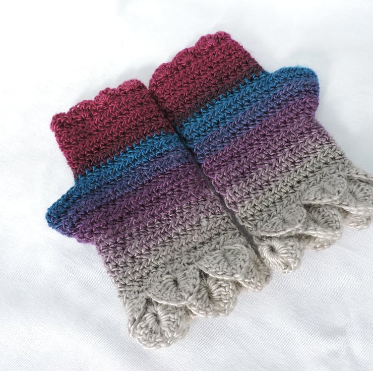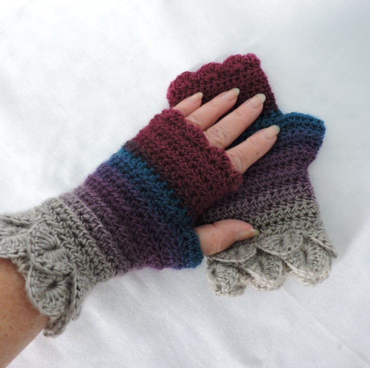 Crocheted fingerless mitts with dragon scale cuffs which I have crocheted with a 100% acrylic double knit self striping yarn. Graduated colours of purple, teal, magenta and grey. There are two rows of dragon scales at the cuffs, a plain body and a wavy edge to the top.. A stylish and cosy winter warmer.