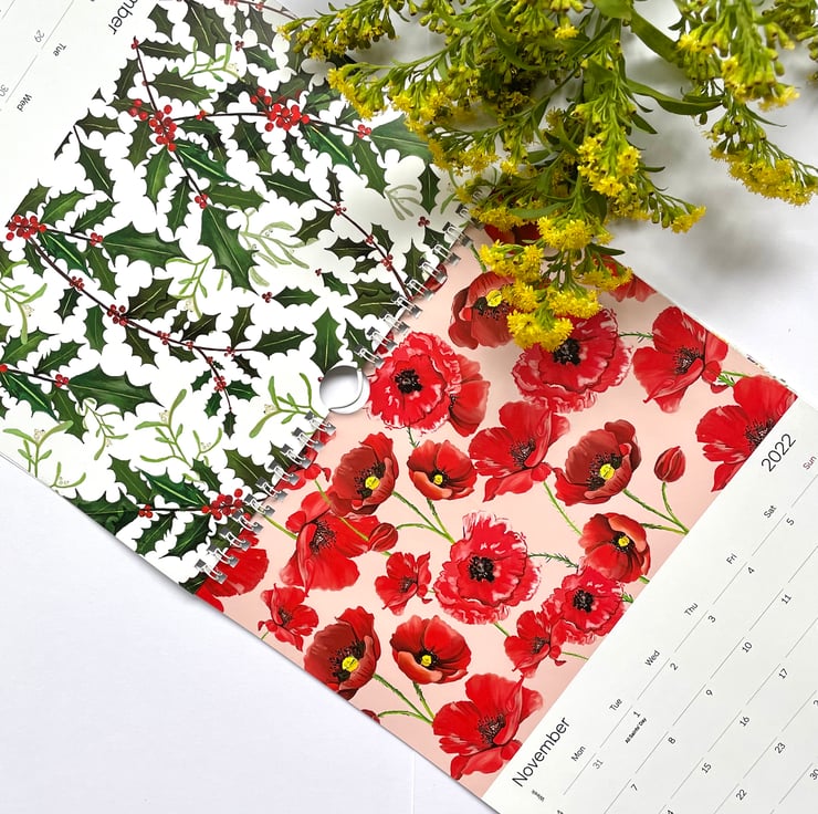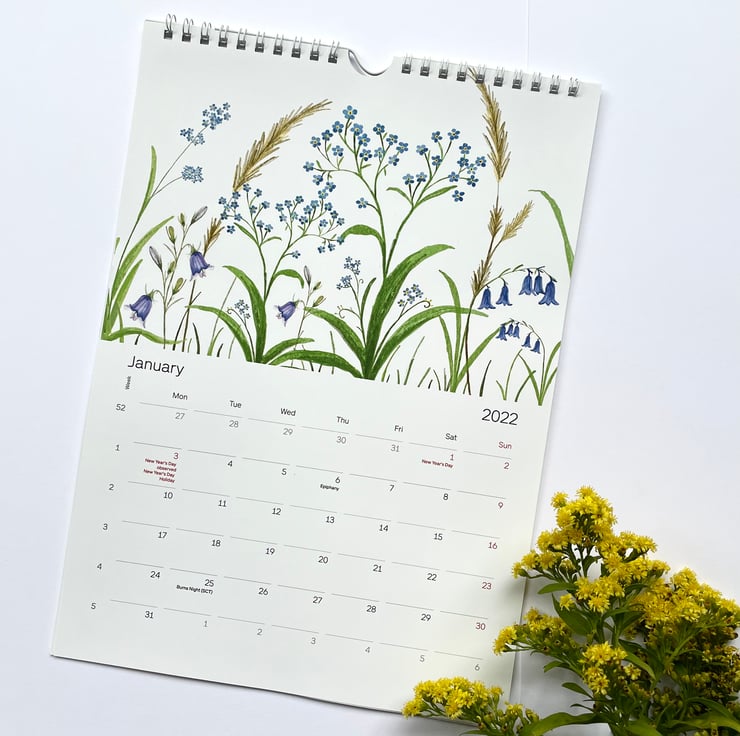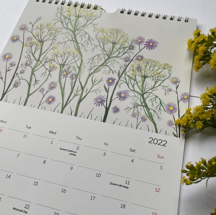 An a4 wall calendar comprising of a world of wildflowers. All illustrations have been digitally drawn by Emilyainsworthprint and provide a pop of colour every day of the year.