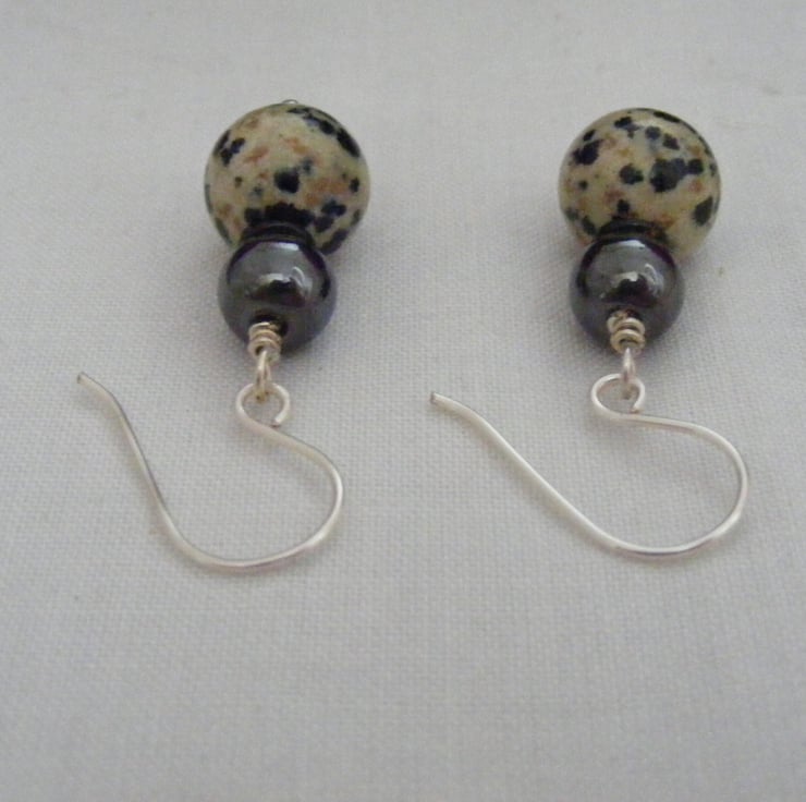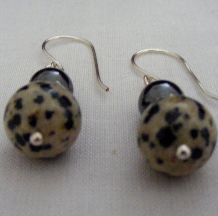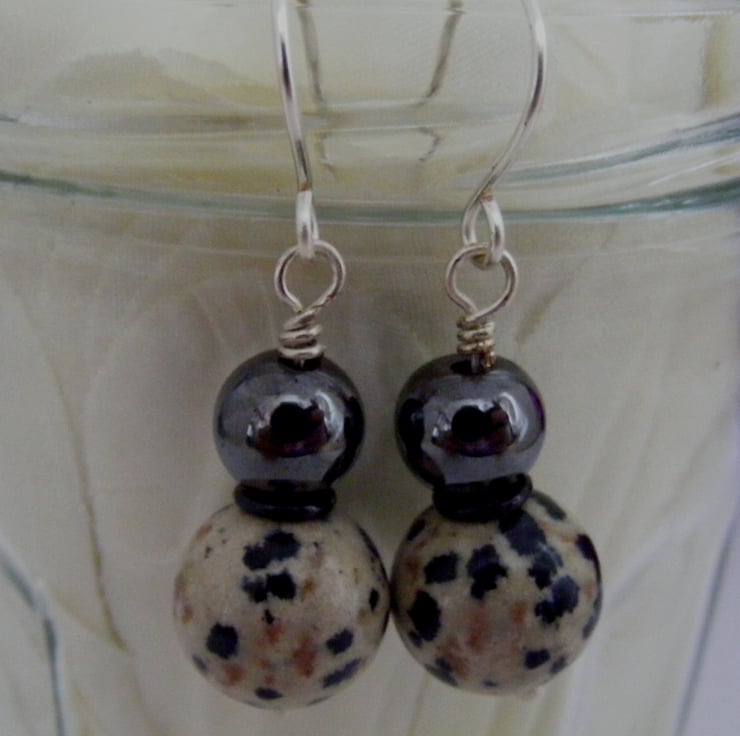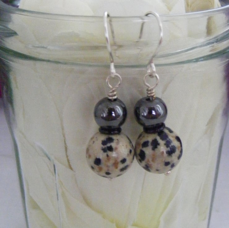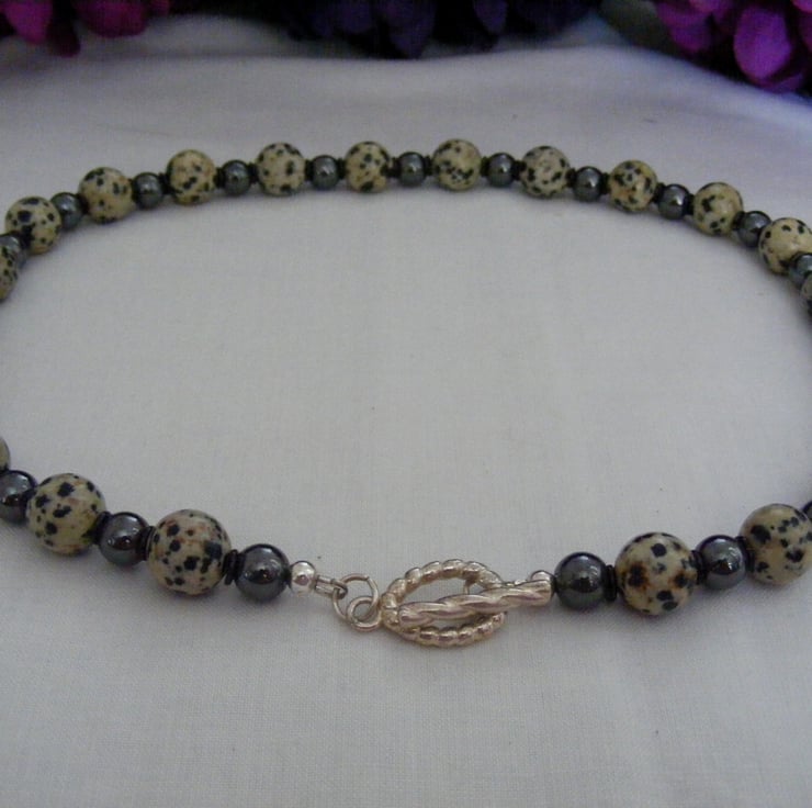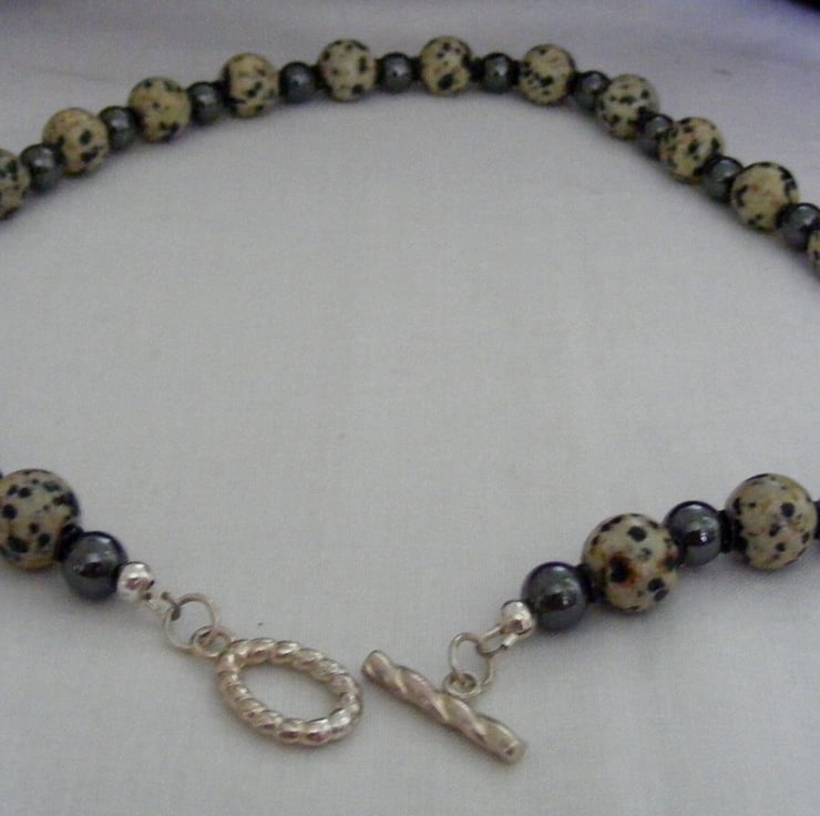 Gemstone jewellery set includes a necklace with matching earrings. I've handmade this set with, 12 mm dalmation jasper rounds, 8 mm hematite rounds and handmade black jump rings. These are threaded onto beading wire, with the ends finished with silver plated findings. Clasp is a silver plated toggle. Earrings have handmade silver plated ear wires. Wire used is hypo allergenic and resistant to tarnishing.