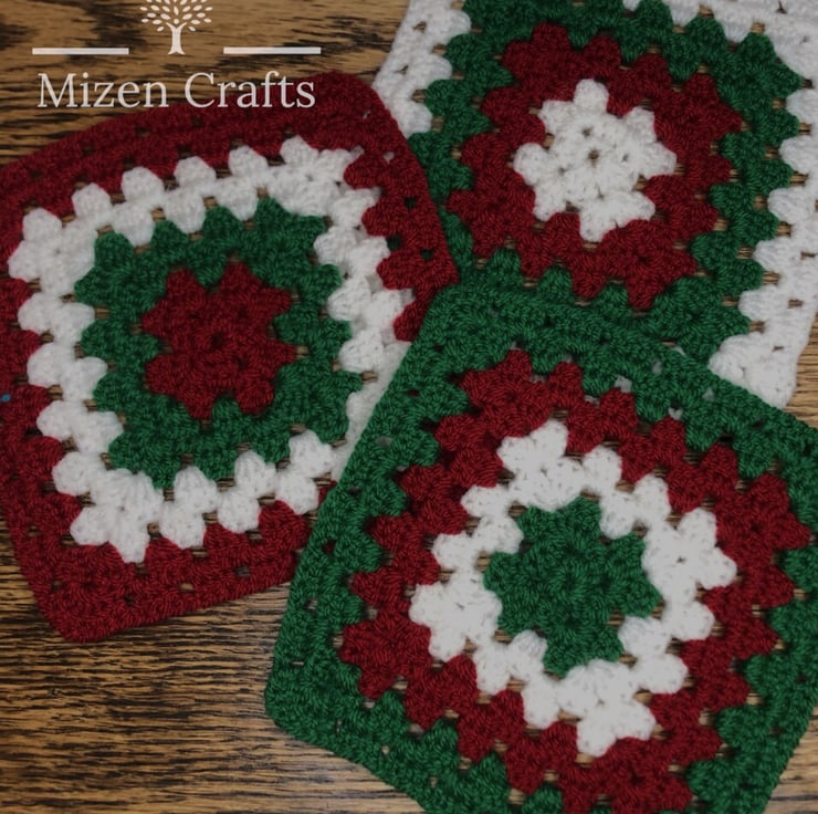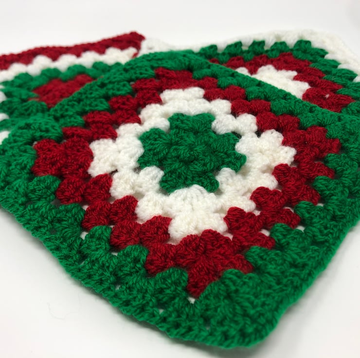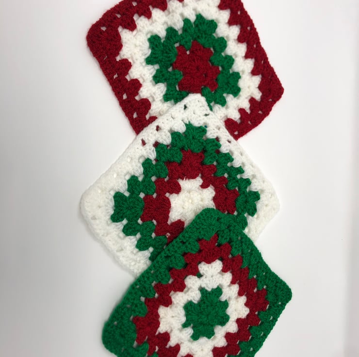 This set of 3 crochet dishcloths have been made using red, white and green wool in a traditional granny square design. Machine washable. They measure approx 17cm square.
