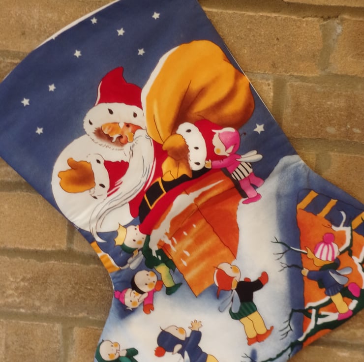This Christmas Stocking features a Mabel Lucy Atwell design of elves and Santa on a snowy roof. Both sides of the stocking - which measures approximately 18 inches (46 cm) from the top to the bottom of the foot - are identical.